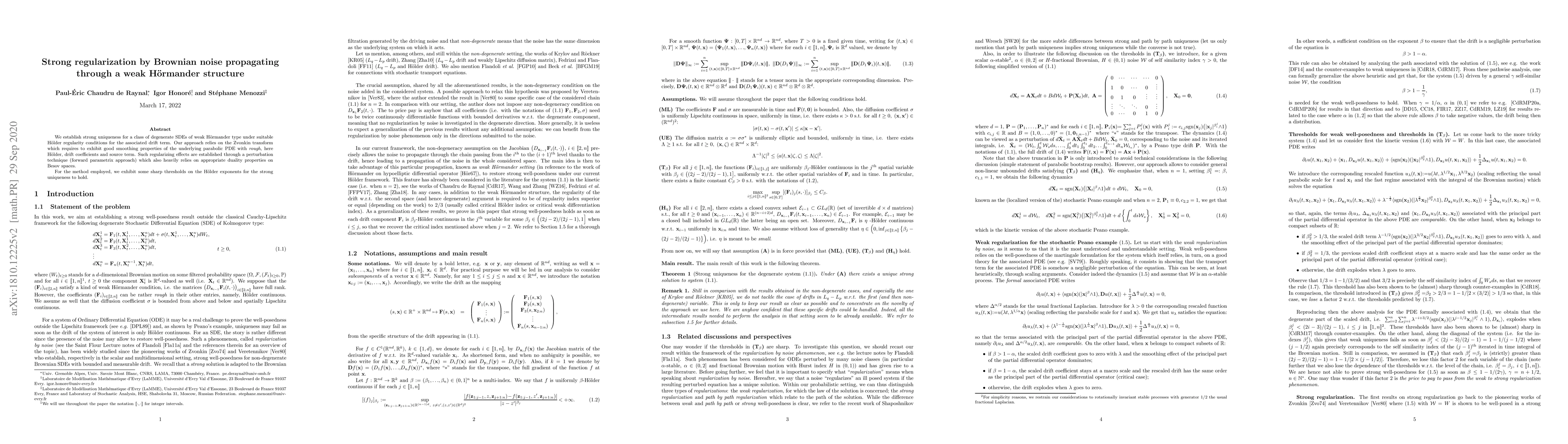 We establish strong uniqueness for a class of degenerate SDEs of weak H{\"o}rmander type under suitable H{\"o}lder regularity conditions for the associated drift term. Our approach relies on the Zvonkin transform which requires to exhibit good smoothing properties of the underlying parabolic PDE with rough, here H{\"o}lder, drift coefficients and source term. Such regularizing effects are established through a perturbation technique (forward parametrix approach) which also heavily relies on appropriate duality properties on Besov spaces. For the method employed, we exhibit some sharp thresholds on the H{\"o}lder exponents for the strong uniqueness to hold.
