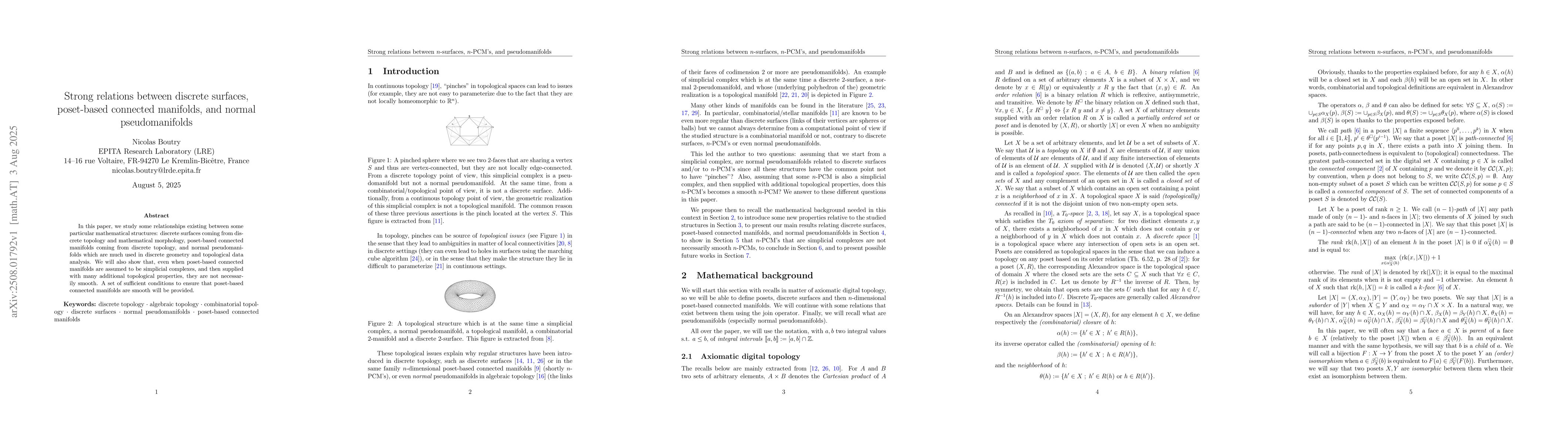 In this paper, we study some relationships existing between some particular mathematical structures: discrete surfaces coming from discrete topology and mathematical morphology, poset-based connected manifolds coming from discrete topology, and normal pseudomanifolds which are much used in discrete geometry and topological data analysis. We will also show that, even when poset-based connected manifolds are assumed to be simplicial complexes, and then supplied with many additional topological properties, they are not necessarily smooth. A set of sufficient conditions to ensure that poset-based connected manifolds are smooth will be provided.