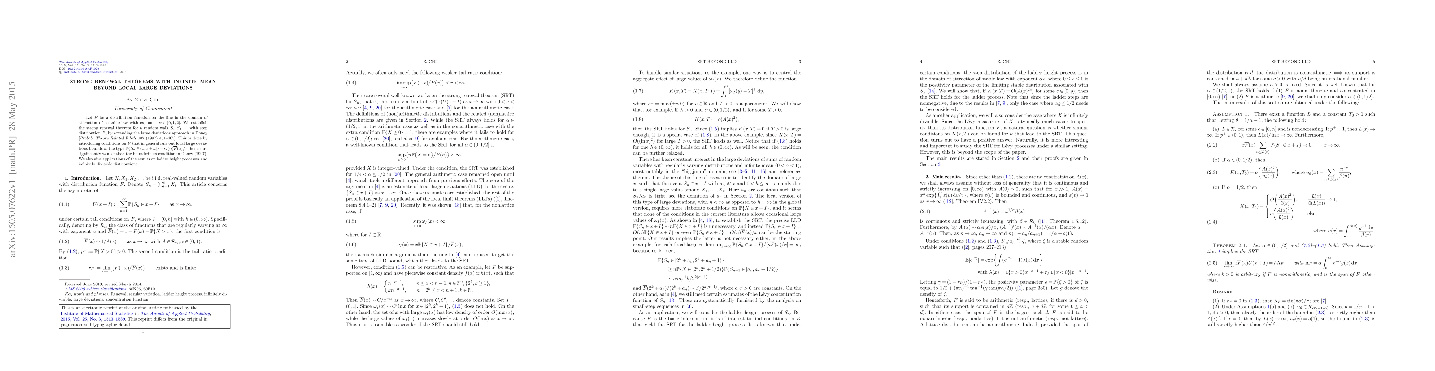 Let $F$ be a distribution function on the line in the domain of attraction of a stable law with exponent $\alpha\in(0,1/2]$. We establish the strong renewal theorem for a random walk $S_1,S_2,\ldots$ with step distribution $F$, by extending the large deviations approach in Doney [Probab. Theory Related Fileds 107 (1997) 451-465]. This is done by introducing conditions on $F$ that in general rule out local large deviations bounds of the type $\mathbb{P}\{S_n\in(x,x+h]\}=O(n)\overline{F}(x)/x$, hence are significantly weaker than the boundedness condition in Doney (1997). We also give applications of the results on ladder height processes and infinitely divisible distributions.