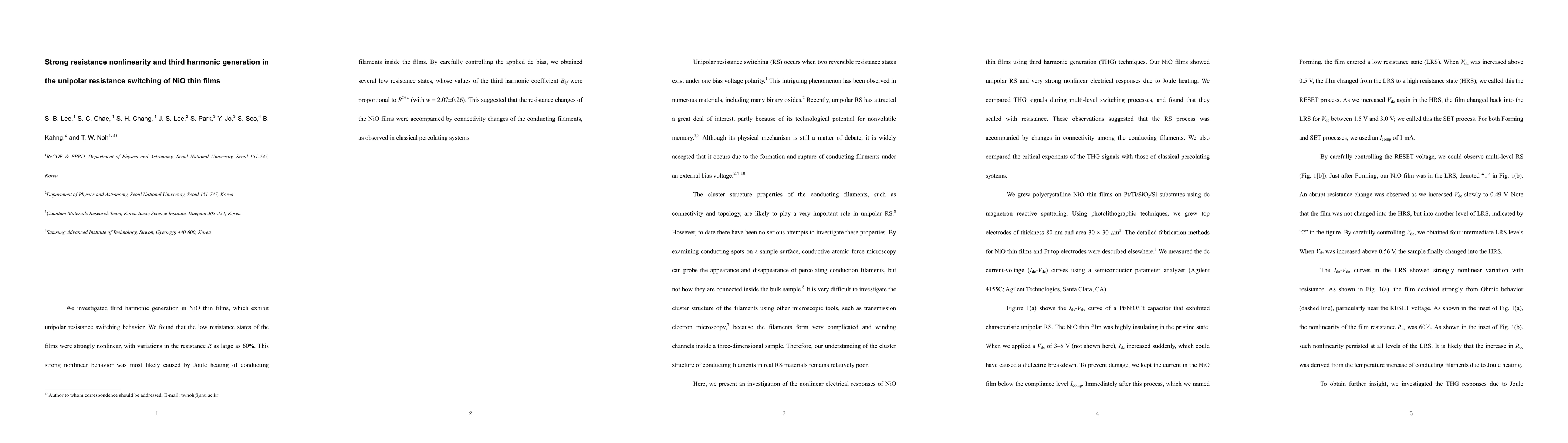 This study investigates third harmonic generation in NiO thin films with unipolar resistance switching, revealing strong nonlinearity in low resistance states due to Joule heating. The third harmonic coefficient B3f was found to be proportional to R2+w (w = 2.07), indicating connectivity changes in conducting filaments akin to classical percolation systems.