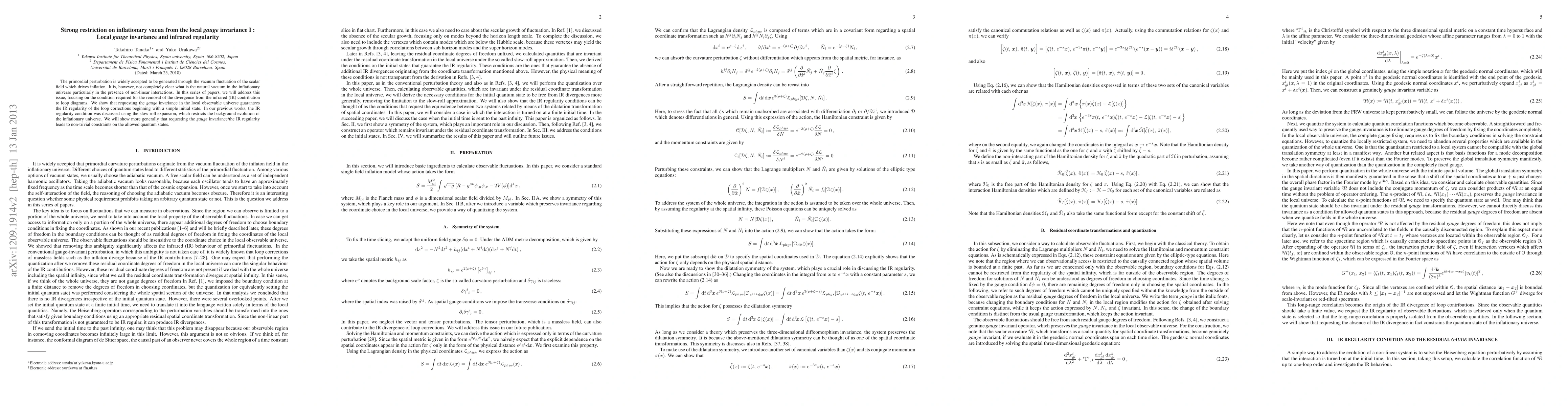 The primordial perturbation is widely accepted to be generated through the vacuum fluctuation of the scalar field which drives inflation. It is, however, not completely clear what is the natural vacuum in the inflationary universe particularly in the presence of non-linear interactions. In this series of papers, we will address this issue, focusing on the condition required for the removal of the divergence from the infrared (IR) contribution to loop diagrams. We show that requesting the gauge invariance in the local observable universe guarantees the IR regularity of the loop corrections beginning with a simple initial state. In our previous works, the IR regularity condition was discussed using the slow roll expansion, which restricts the background evolution of the inflationary universe. We will show more generally that requesting the gauge invariance/the IR regularity leads to non-trivial constraints on the allowed quantum states.