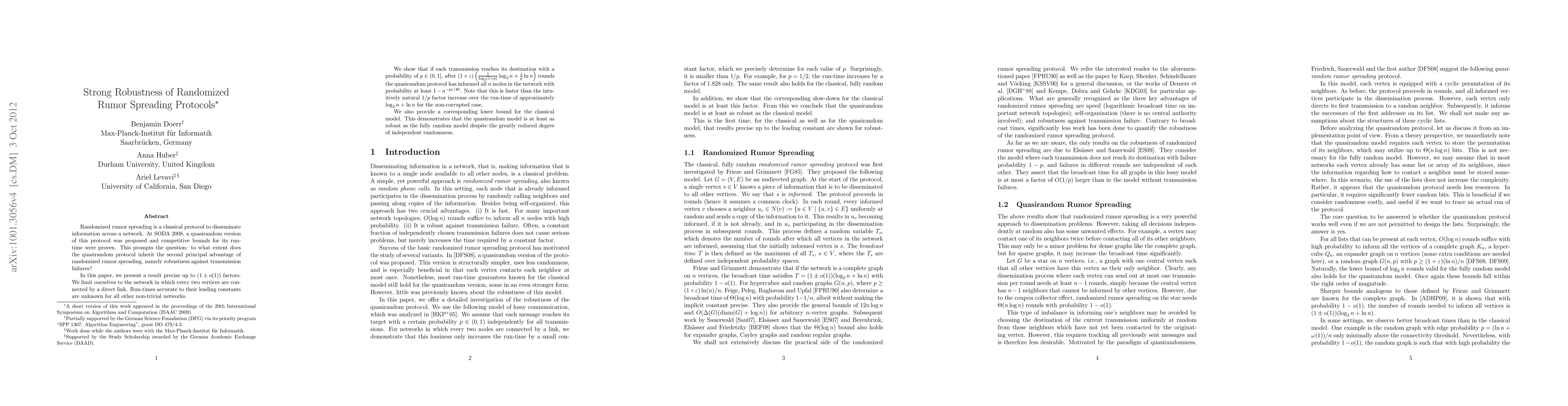 This paper investigates the robustness of a quasirandom protocol for randomized rumor spreading in networks, showing it achieves near-optimal performance in terms of dissemination speed despite reduced randomness. The quasirandom protocol is proven to inform all nodes in the network faster than expected, demonstrating its robustness against transmission failures.