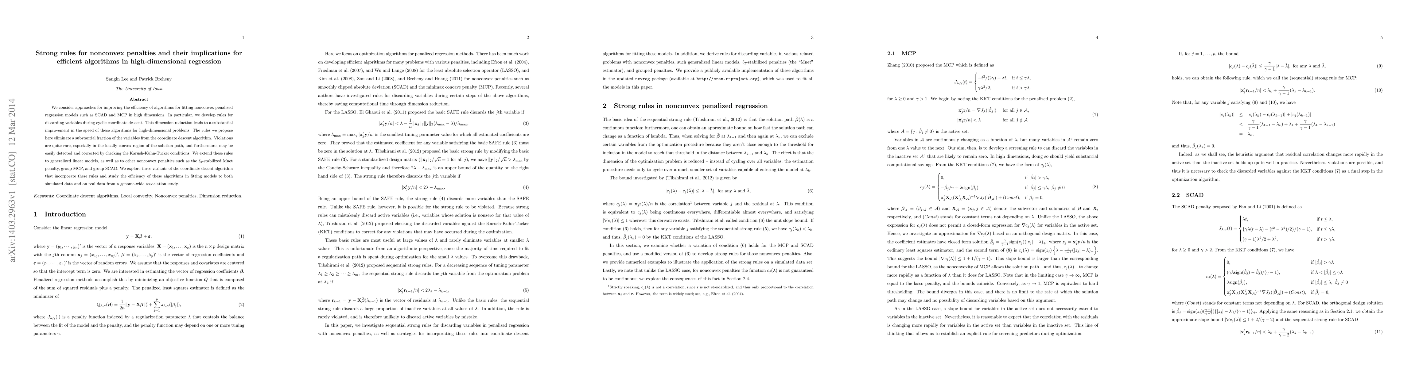We consider approaches for improving the efficiency of algorithms for fitting nonconvex penalized regression models such as SCAD and MCP in high dimensions. In particular, we develop rules for discarding variables during cyclic coordinate descent. This dimension reduction leads to a substantial improvement in the speed of these algorithms for high-dimensional problems. The rules we propose here eliminate a substantial fraction of the variables from the coordinate descent algorithm. Violations are quite rare, especially in the locally convex region of the solution path, and furthermore, may be easily detected and corrected by checking the Karush-Kuhn-Tucker conditions. We extend these rules to generalized linear models, as well as to other nonconvex penalties such as the $\ell_2$-stabilized Mnet penalty, group MCP, and group SCAD. We explore three variants of the coordinate decent algorithm that incorporate these rules and study the efficiency of these algorithms in fitting models to both simulated data and on real data from a genome-wide association study.