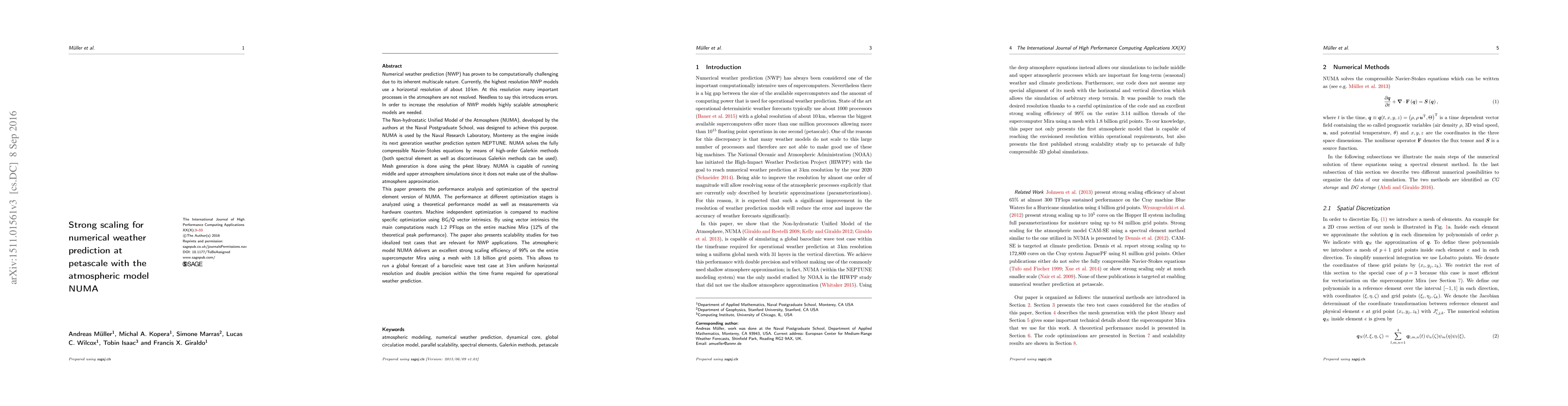 This paper investigates the performance and scalability of the NUMA atmospheric model for high-resolution numerical weather prediction, achieving 1.2 PFlops using vector intrinsics on the Mira supercomputer. It demonstrates strong scaling efficiency of 99% with 1.8 billion grid points, enabling operational weather forecasts at 3km resolution.