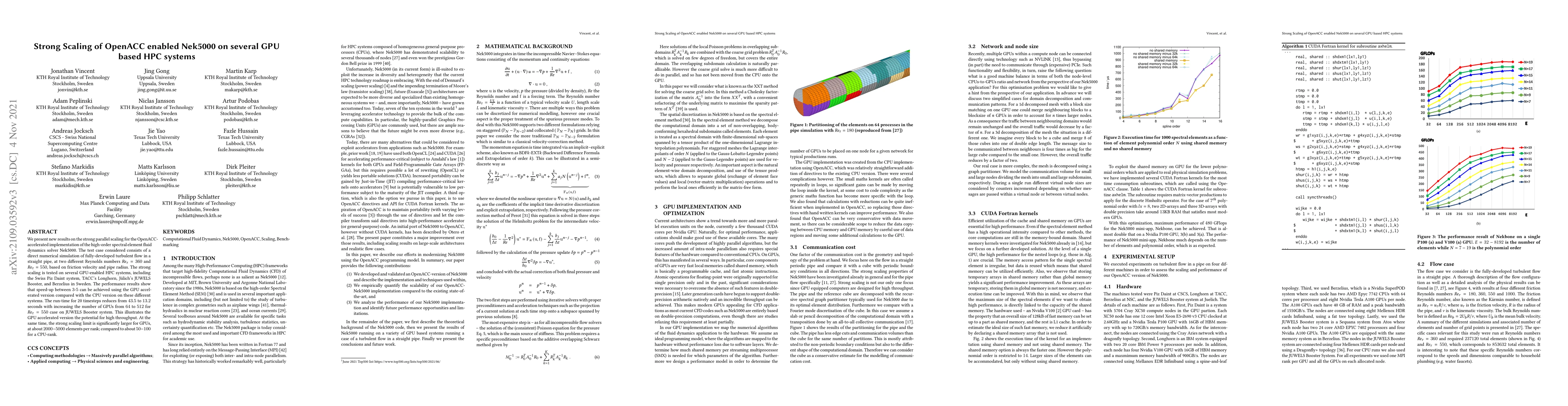 This study investigates the strong scaling performance of an OpenACC-optimized version of Nek5000 on various GPU-based HPC systems, showing a 3-5x speed-up over CPU versions. On the JUWELS Booster system, run-time for 20 timesteps decreases from 43.5 to 13.2 seconds as GPUs increase from 64 to 512, highlighting significant scalability and throughput potential.