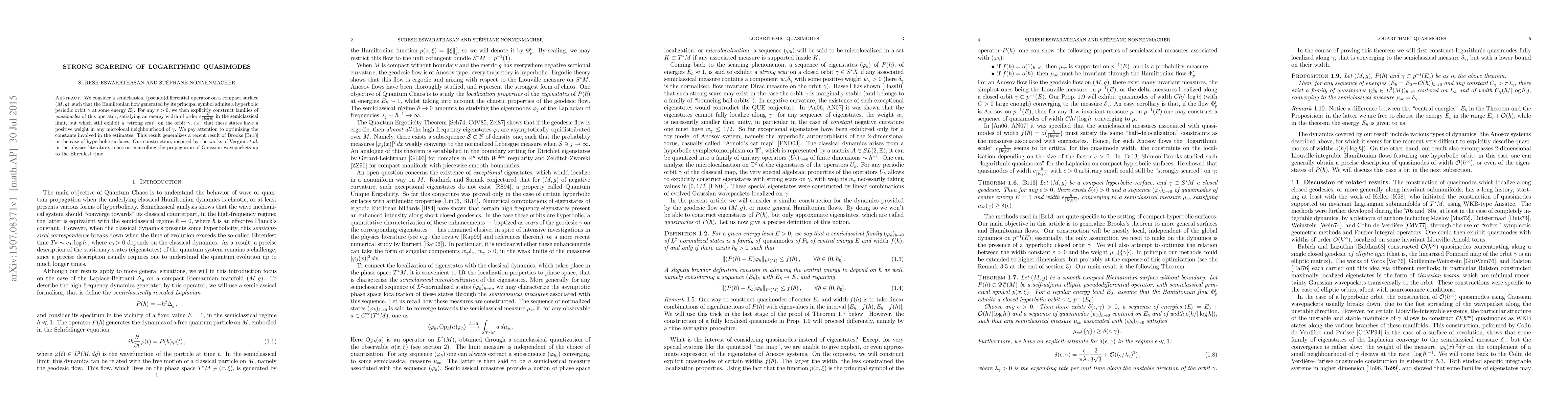 This paper constructs families of logarithmic quasimodes for a semiclassical operator on a compact surface, showing they exhibit strong scarring along a hyperbolic periodic orbit despite having a narrow energy width. The study optimizes constants and generalizes previous results, inspired by physics literature on wavepacket propagation.