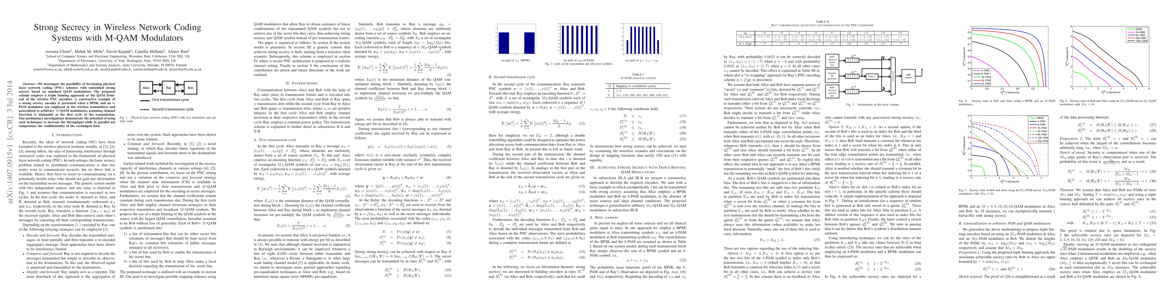 This paper explores physical layer network coding (PNC) with strong secrecy using M-QAM modulators, proposing a triple binning approach. It demonstrates a constructive example with BPSK and 8-PAM modulators, showing potential for increased throughput without compromising data confidentiality.