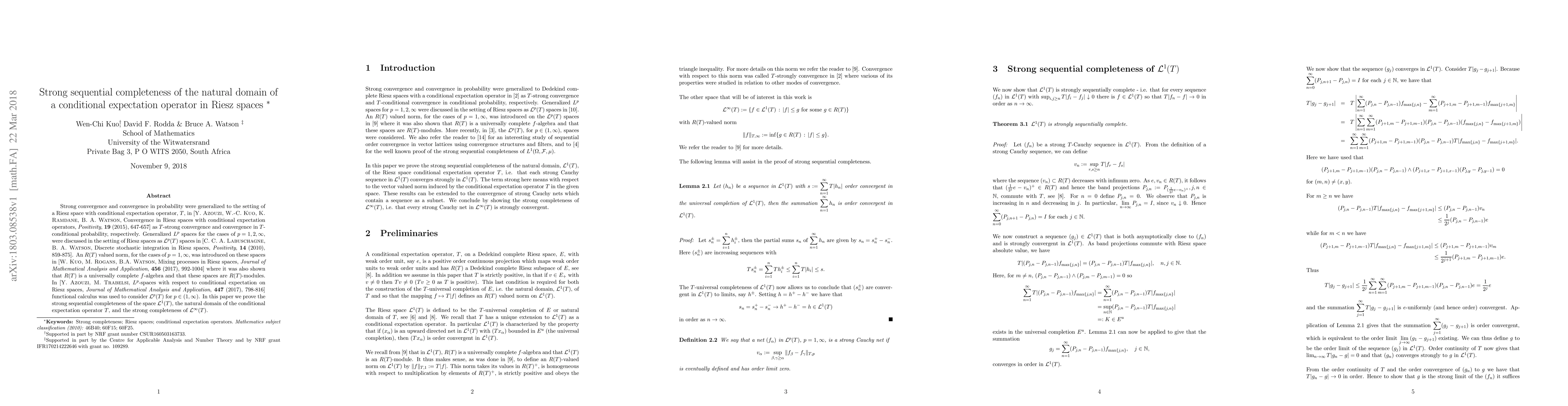 Strong convergence and convergence in probability were generalized to the setting of a Riesz space with conditional expectation operator, $T$, in [{{\sc Y. Azouzi, W.-C. Kuo, K. Ramdane, B. A. Watson}, {Convergence in Riesz spaces with conditional expectation operators}, {\em Positivity}, {\bf 19} {(2015), 647-657}}] as $T$-strong convergence and convergence in $T$-conditional probability, respectively. Generalized $L^{p}$ spaces for the cases of $p=1,2,\infty$, were discussed in the setting of Riesz spaces as $\mathcal{L}^{p}(T)$ spaces in [{{\sc C. C. A. Labuschagne, B. A. Watson}, {Discrete stochastic integration in Riesz spaces}, {\em Positivity}, {\bf 14} {(2010), 859-875}}]. An $R(T)$ valued norm, for the cases of $p=1,\infty,$ was introduced on these spaces in [{{\sc W. Kuo, M. Rogans, B.A. Watson}, {Mixing processes in Riesz spaces}, {\em Journal of Mathematical Analysis and Application}, {\bf 456} {(2017), 992-1004}}] where it was also shown that $R(T)$ is a universally complete $f$-algebra and that these spaces are $R(T)$-modules. In [{{\sc Y. Azouzi, M. Trabelsi}, {$L^p$-spaces with respect to conditional expectation on Riesz spaces}, {\em Journal of Mathematical Analysis and Application}, {\bf 447} {(2017), 798-816}}] functional calculus was used to consider $\mathcal{L}^{p}(T)$ for $p\in (1,\infty)$. In this paper we prove the strong sequential completeness of the space $\mathcal{L}^{1}(T)$, the natural domain of the conditional expectation operator $T$, and the strong completeness of $\mathcal{L}^{\infty}(T)$.