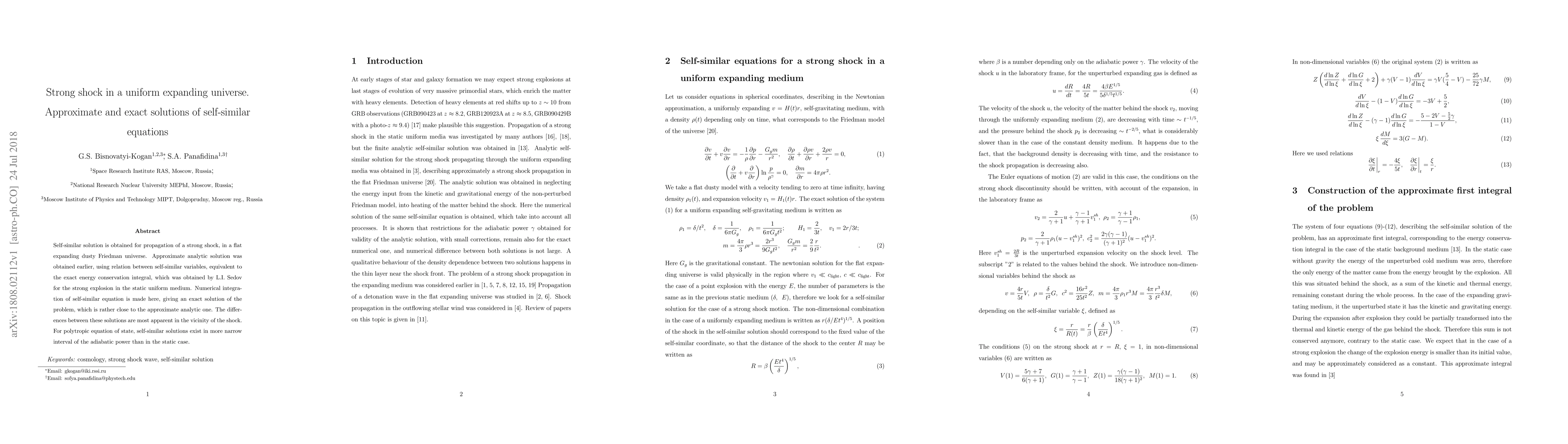 This research derives exact solutions for strong shock propagation in an expanding universe using self-similar equations. It compares these results to an approximate analytic solution, finding them close except near the shock. The study also reveals that for a polytropic equation of state, self-similar solutions exist within a narrower adiabatic power range compared to a static medium.