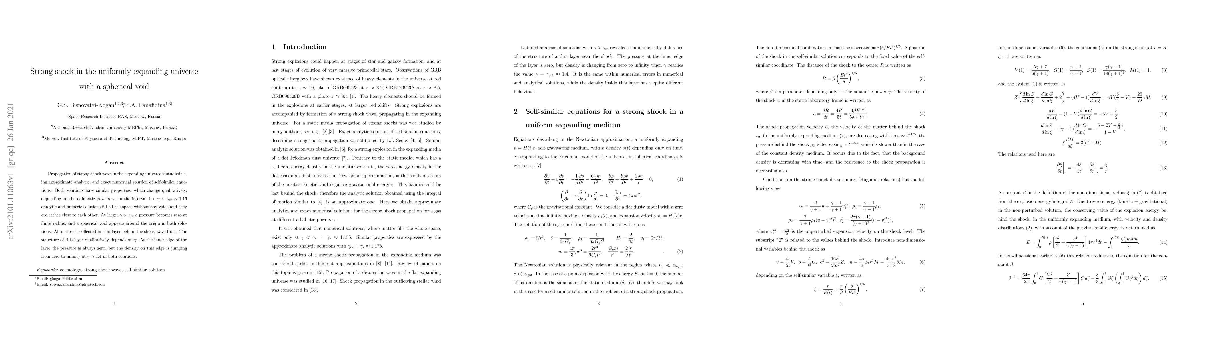 Propagation of strong shock wave in the expanding universe is studied using approximate analytic, and exact numerical solution of self-similar equations. Both solutions have similar properties, which change qualitatively, depending on the adiabatic powers $\gamma$. In the interval $1<\gamma<\gamma_{cr} \sim 1.16$ analytic and numeric solutions fill all the space without any voids and they are rather close to each other. At larger $\gamma>\gamma_{cr}$ a pressure becomes zero at finite radius, and a spherical void appears around the origin in both solutions. All matter is collected in thin layer behind the shock wave front. The structure of this layer qualitatively depends on $\gamma$. At the inner edge of the layer the pressure is always zero, but the density on this edge is jumping from zero to infinity at $\gamma \approx 1.4$ in both solutions.