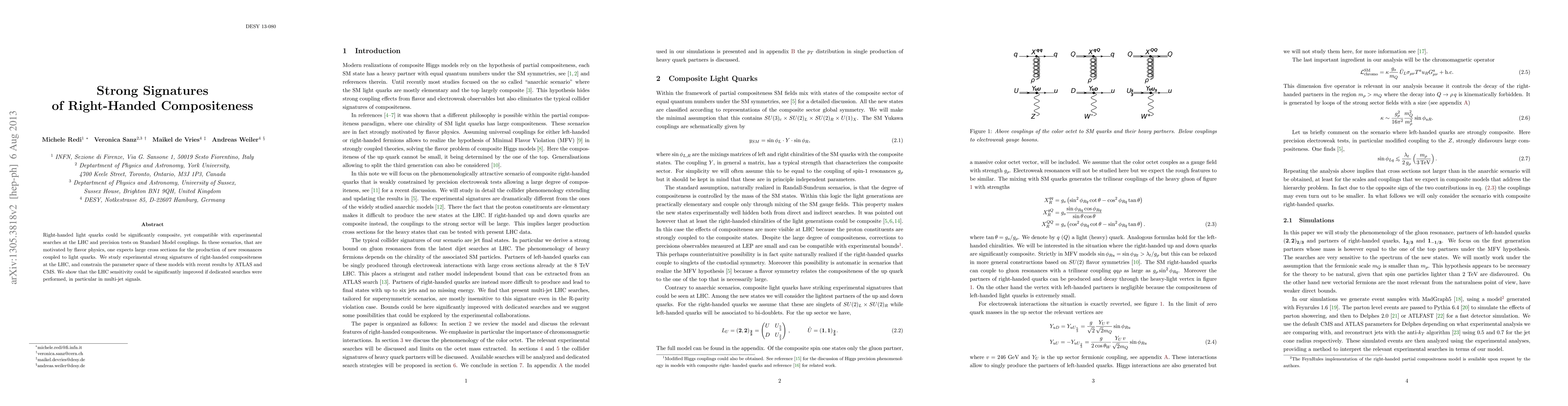 Right-handed light quarks could be significantly composite, yet compatible with experimental searches at the LHC and precision tests on Standard Model couplings. In these scenarios, that are motivated by flavor physics, one expects large cross sections for the production of new resonances coupled to light quarks. We study experimental strong signatures of right-handed compositeness at the LHC, and constrain the parameter space of these models with recent results by ATLAS and CMS. We show that the LHC sensitivity could be significantly improved if dedicated searches were performed, in particular in multi-jet signals.