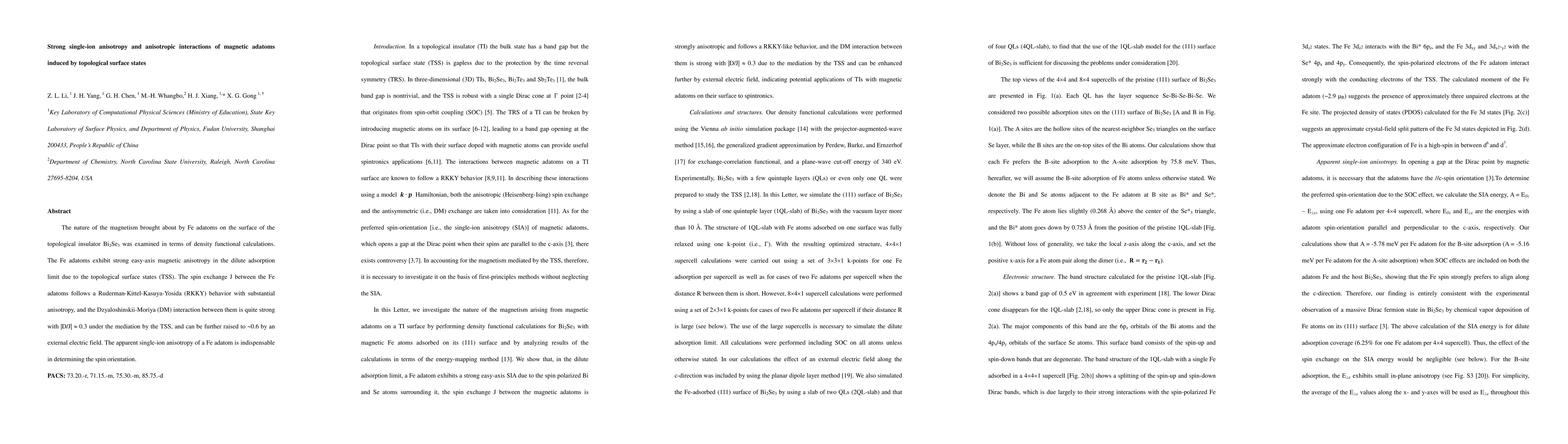 The nature of the magnetism brought about by Fe adatoms on the surface of the topological insulator Bi2Se3 was examined in terms of density functional calculations. The Fe adatoms exhibit strong easy-axis magnetic anisotropy in the dilute adsorption limit due to the topological surface states (TSS). The spin exchange J between the Fe adatoms follows a Ruderman-Kittel-Kasuya-Yosida (RKKY) behavior with substantial anisotropy, and the Dzyaloshinskii-Moriya (DM) interaction between them is quite strong with |D/J|~0.3 under the mediation by the TSS, and can be further raised to ~0.6 by an external electric field. The apparent single-ion anisotropy of a Fe adatom is indispensable in determining the spin orientation.