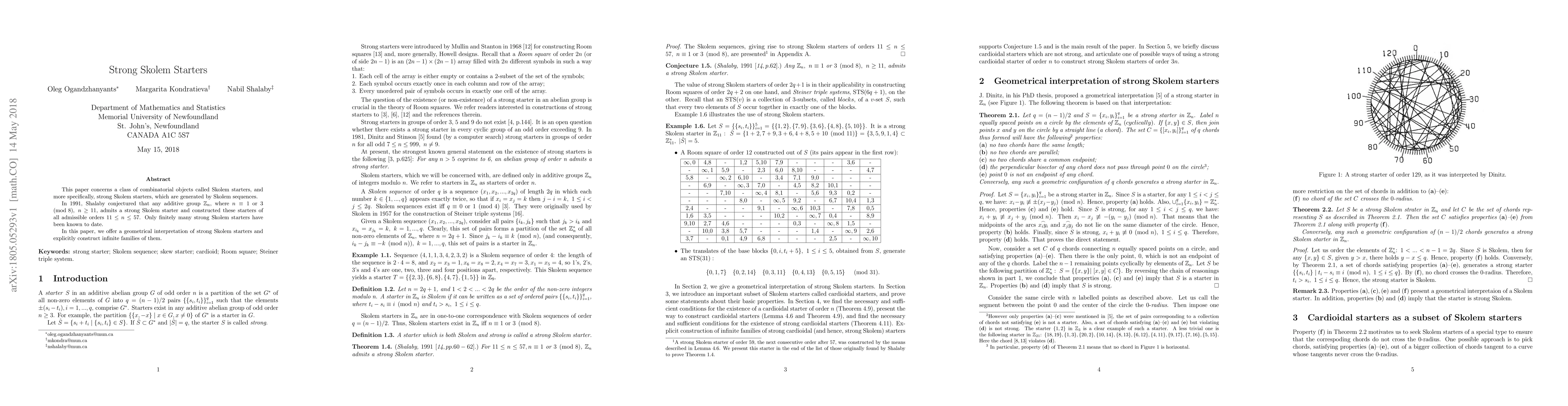 This paper explores Skolem starters, particularly strong Skolem starters generated by Skolem sequences, and provides a geometrical interpretation to construct infinite families of these combinatorial objects, resolving Shalaby's 1991 conjecture for certain additive groups.