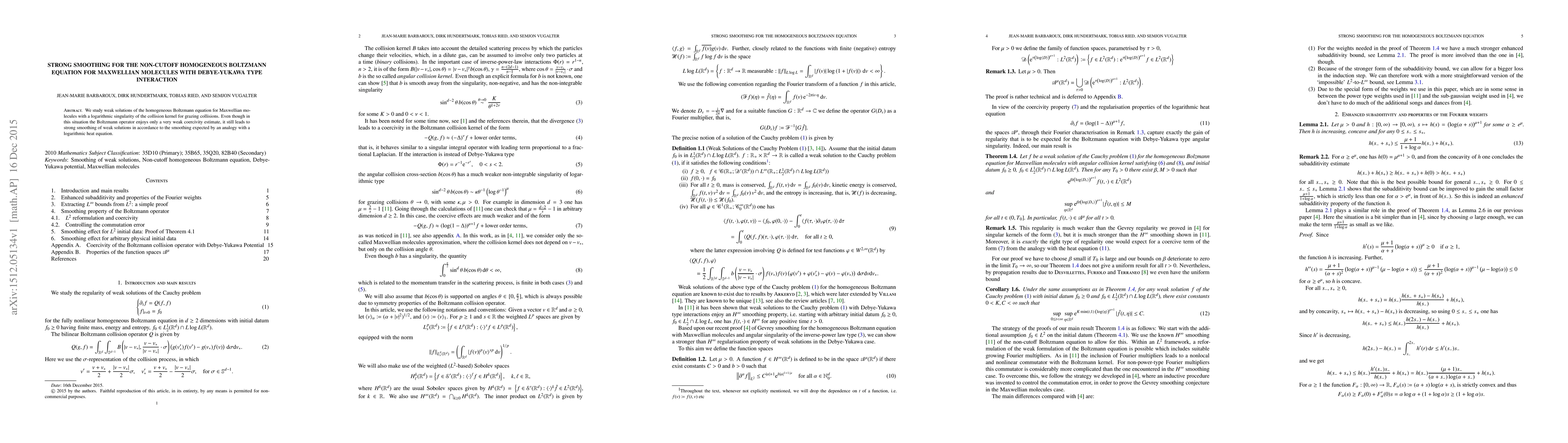 The paper investigates the homogeneous Boltzmann equation for Maxwellian molecules with a logarithmic collision kernel, showing strong smoothing of weak solutions despite weak coercivity. This finding aligns with expectations from a logarithmic heat equation analogy.