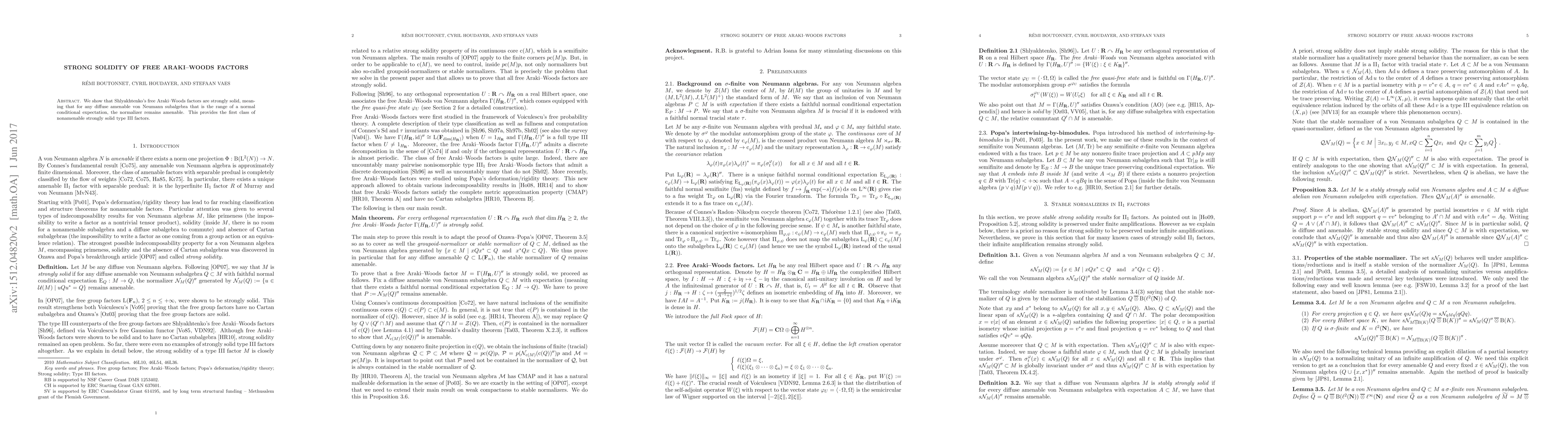 The paper demonstrates that Shlyakhtenko's free Araki-Woods factors are strongly solid, ensuring amenability of their normalizers, and establishes them as the first example of nonamenable strongly solid type III factors.