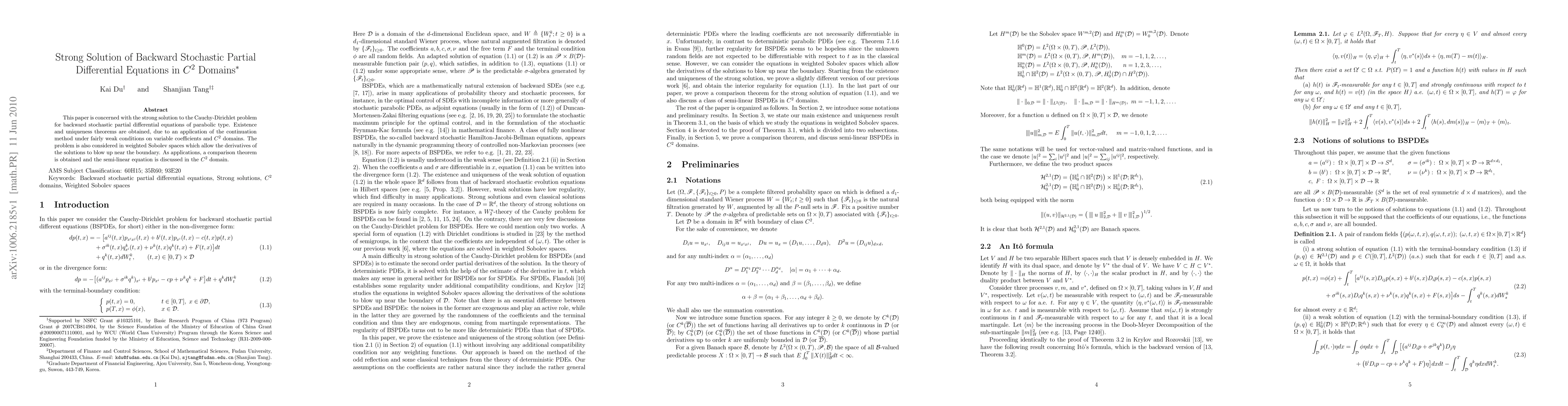 This paper establishes strong solutions to backward stochastic partial differential equations in C^2 domains using weak conditions and weighted Sobolev spaces, with applications in comparison theorems and semi-linear equations.