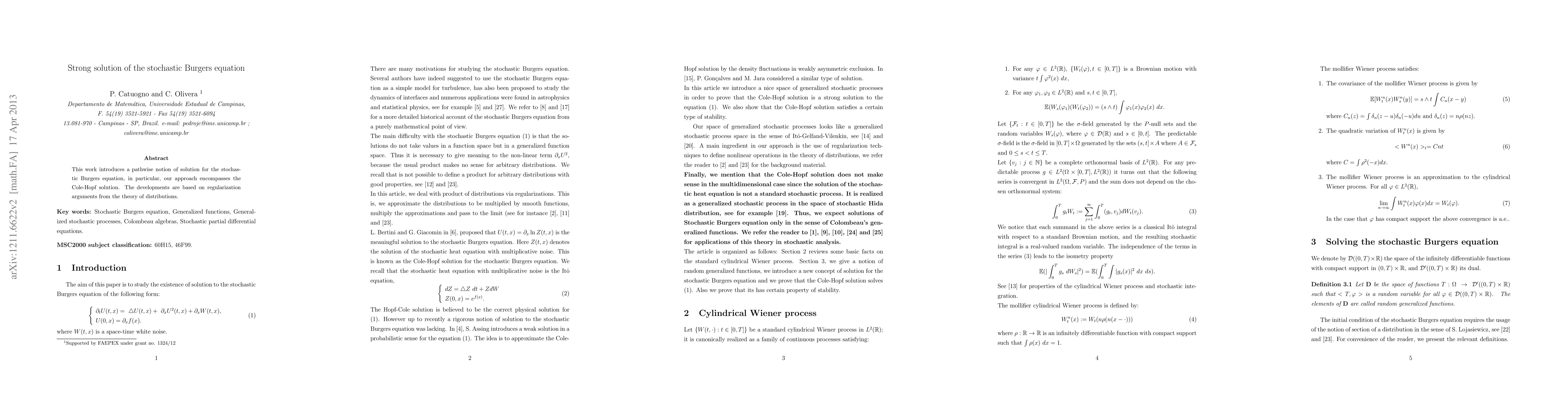 This paper presents a pathwise solution for the stochastic Burgers equation, incorporating the Cole-Hopf transformation, and utilizes regularization techniques from distribution theory to achieve this.