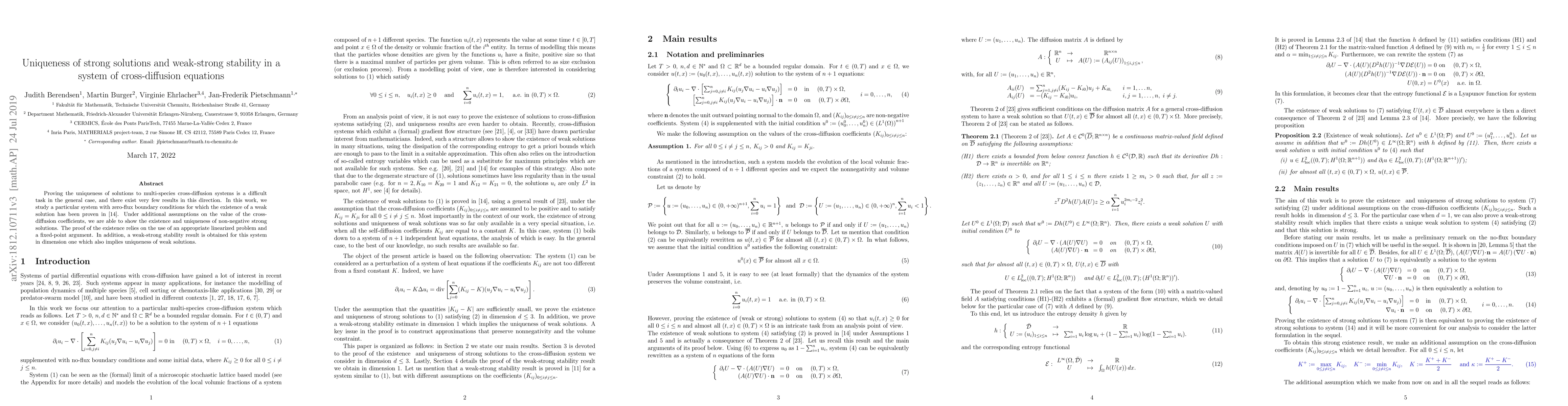 This paper demonstrates the existence and uniqueness of strong solutions for a specific multi-species cross-diffusion system under certain cross-diffusion coefficient conditions, utilizing approximation and fixed-point methods. It also establishes weak-strong stability in one dimension.