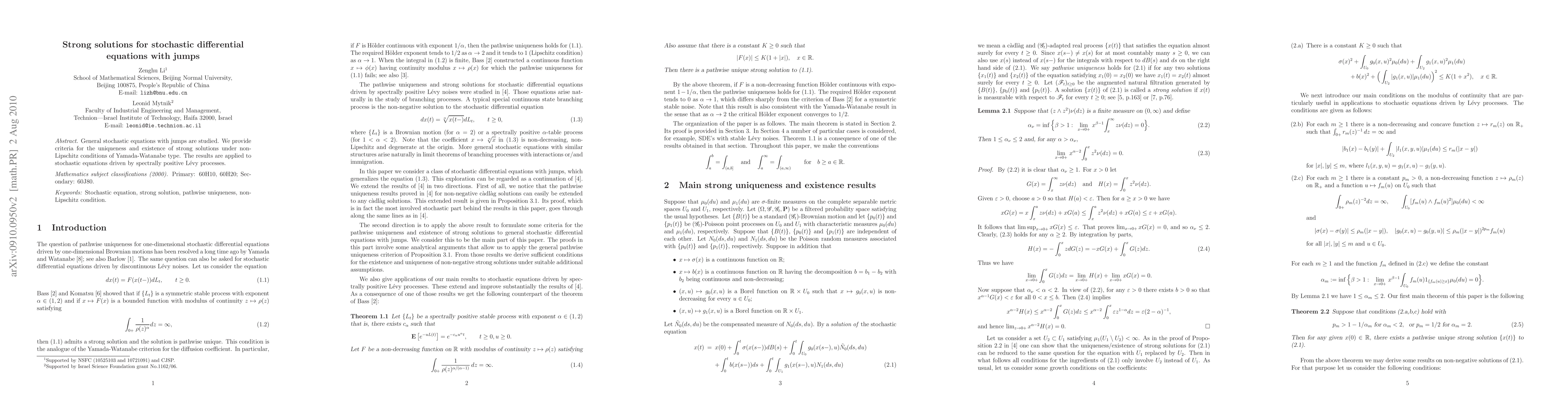This paper explores the existence and uniqueness of strong solutions for stochastic differential equations with jumps under non-Lipschitz conditions. Criteria of Yamada-Watanabe type are introduced, and the results are applied to stochastic equations driven by spectrally positive Lévy processes.