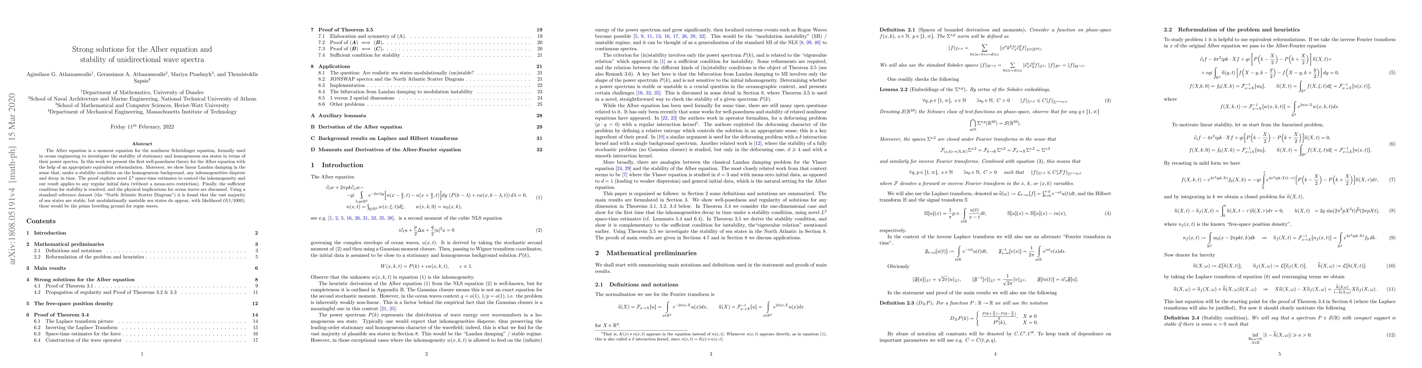 The Alber equation is a moment equation for the nonlinear Schr\"odinger equation, formally used in ocean engineering to investigate the stability of stationary and homogeneous sea states in terms of their power spectra. In this work we present the first well-posedness theory for the Alber equation with the help of an appropriate equivalent reformulation. Moreover, we show linear Landau damping in the sense that, under a stability condition on the homogeneous background, any inhomogeneities disperse and decay in time. The proof exploits novel $L^2$ space-time estimates to control the inhomogeneity and our result applies to any regular initial data (without a mean-zero restriction). Finally, the sufficient condition for stability is resolved, and the physical implications for ocean waves are discussed. Using a standard reference dataset (the "North Atlantic Scatter Diagram") it is found that the vast majority of sea states are stable, but modulationally unstable sea states do appear, with likelihood $O(1/1000);$ these would be the prime breeding ground for rogue waves.