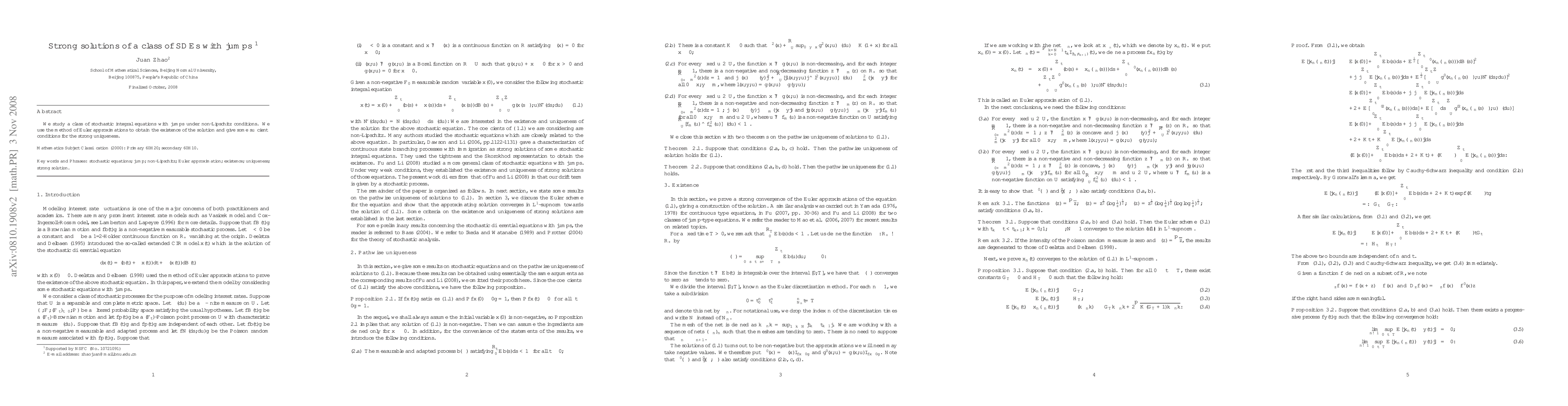 This paper investigates a class of stochastic differential equations with jumps under non-Lipschitz conditions, employing Euler approximations to establish the existence of solutions and provide sufficient conditions for strong uniqueness.