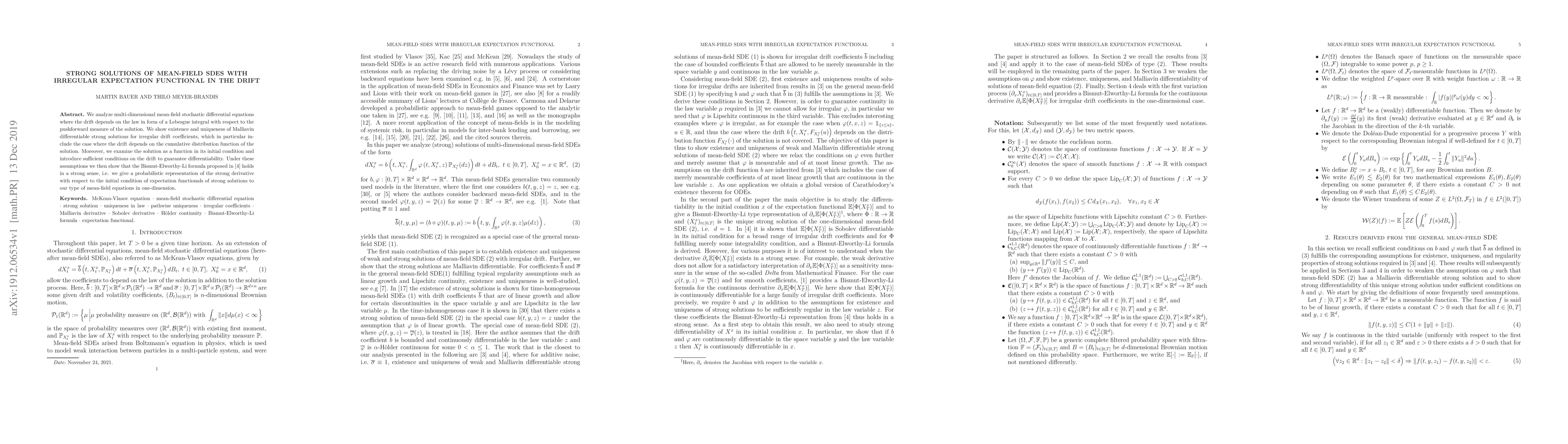 We analyze multi-dimensional mean-field stochastic differential equations where the drift depends on the law in form of a Lebesgue integral with respect to the pushforward measure of the solution. We show existence and uniqueness of Malliavin differentiable strong solutions for irregular drift coefficients, which in particular include the case where the drift depends on the cumulative distribution function of the solution. Moreover, we examine the solution as a function in its initial condition and introduce sufficient conditions on the drift to guarantee differentiability. Under these assumptions we then show that the Bismut-Elworthy-Li formula proposed in Bauer et al. (2018) holds in a strong sense, i.e. we give a probabilistic representation of the strong derivative with respect to the initial condition of expectation functionals of strong solutions to our type of mean-field equations in one-dimension.