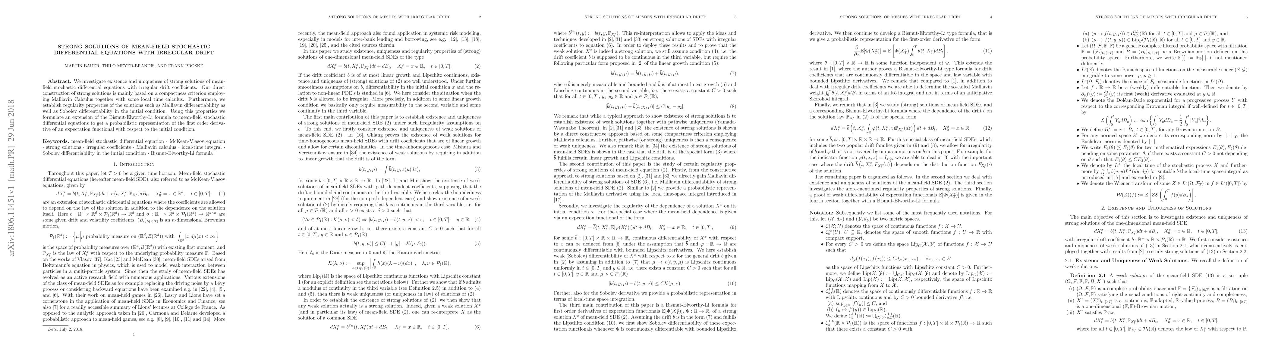 This paper establishes the existence and uniqueness of strong solutions for mean-field stochastic differential equations with irregular drift, utilizing a compactness criterion based on Malliavin Calculus and local time calculus. It also demonstrates regularity properties and extends the Bismut-Elworthy-Li formula for probabilistic representation of derivatives concerning initial conditions.