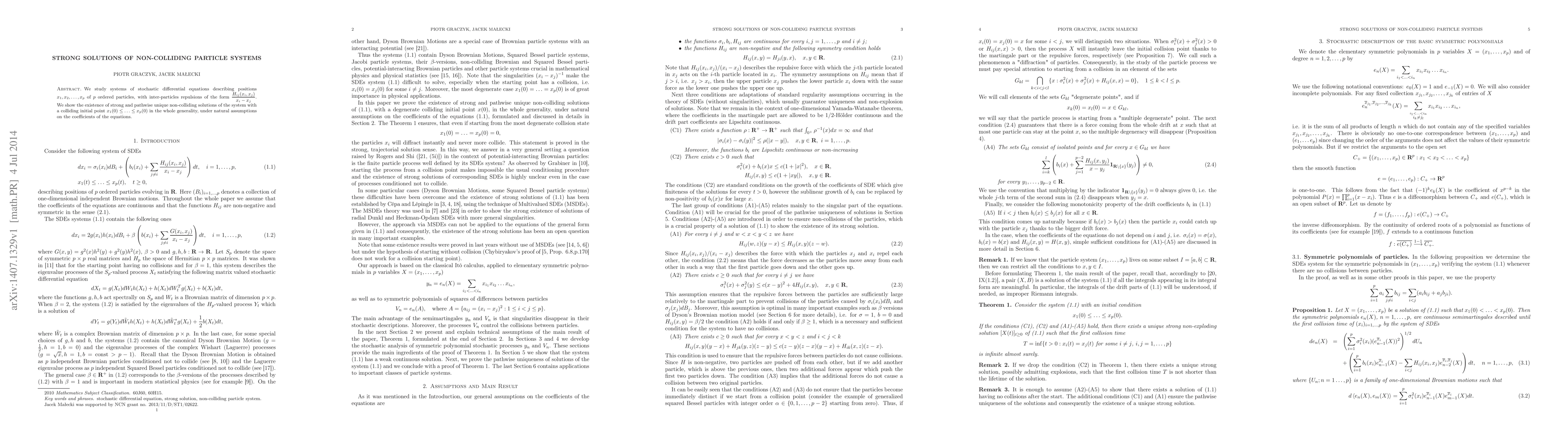 This research proves the existence of unique, non-colliding solutions for systems of stochastic differential equations modeling p particles with repulsive forces. It covers general initial conditions and assumptions on equation coefficients, ensuring strong and pathwise uniqueness.