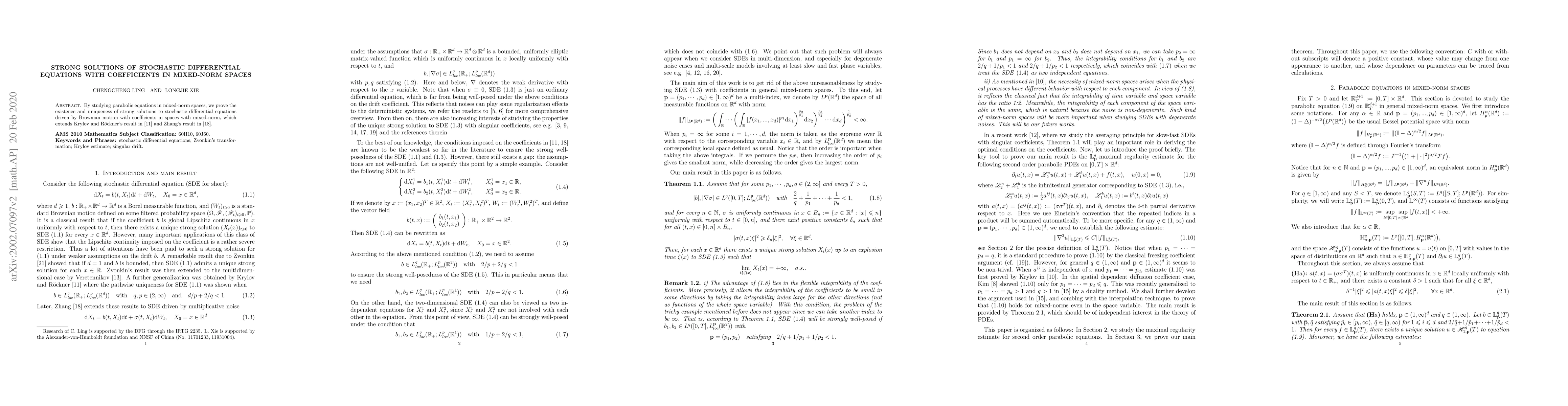This paper proves the existence and uniqueness of strong solutions for stochastic differential equations driven by Brownian motion, where the coefficients are defined in mixed-norm spaces, extending previous results by Krylov, Röckner, and Zhang.