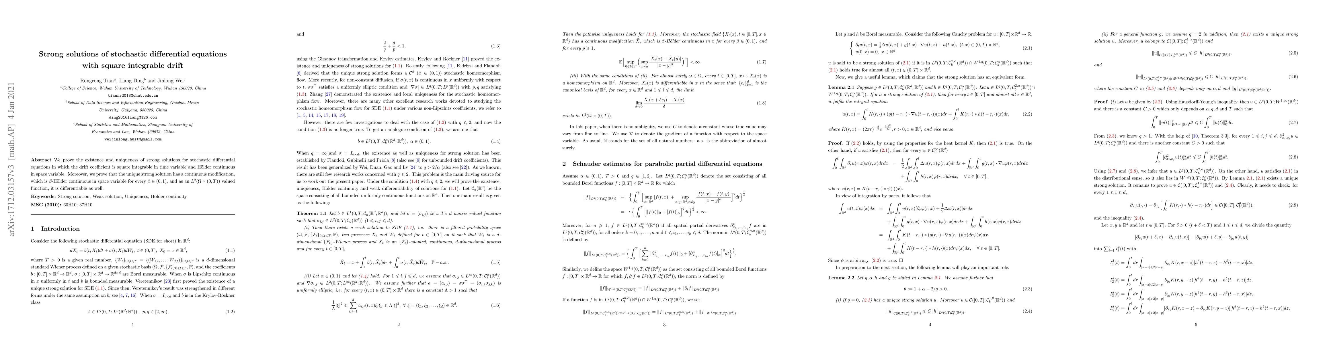 Summary: The paper establishes the existence and uniqueness of strong solutions for stochastic differential equations with square integrable drift and Hölder continuous coefficients. It also demonstrates that these solutions are continuous and differentiable, possessing $\beta$-Hölder continuity for $\beta \in (0,1)$.