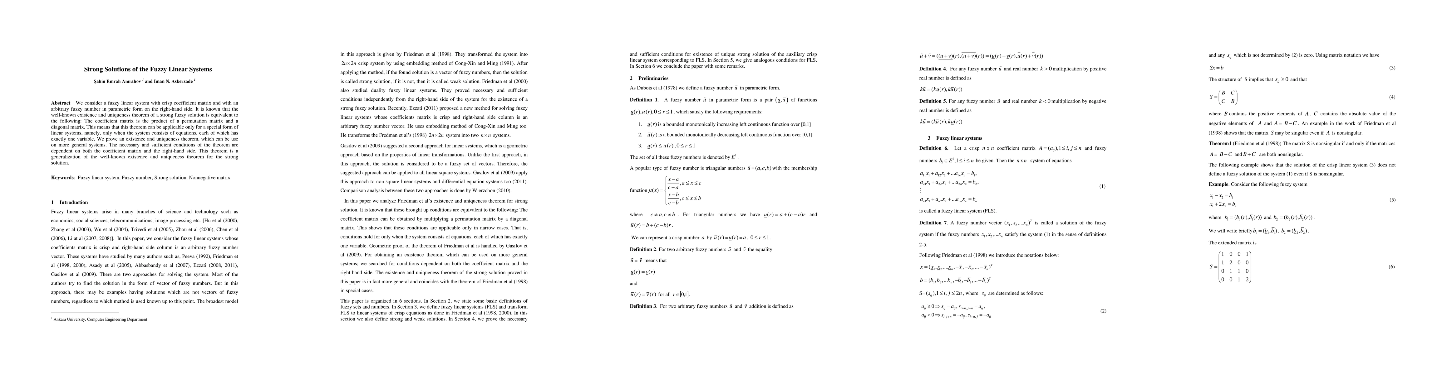 This paper proves an existence and uniqueness theorem for strong solutions of fuzzy linear systems, generalizing the existing theorem that applies only to systems with a specific form. The new theorem's conditions depend on both the coefficient matrix and the right-hand side, extending applicability to more general systems.