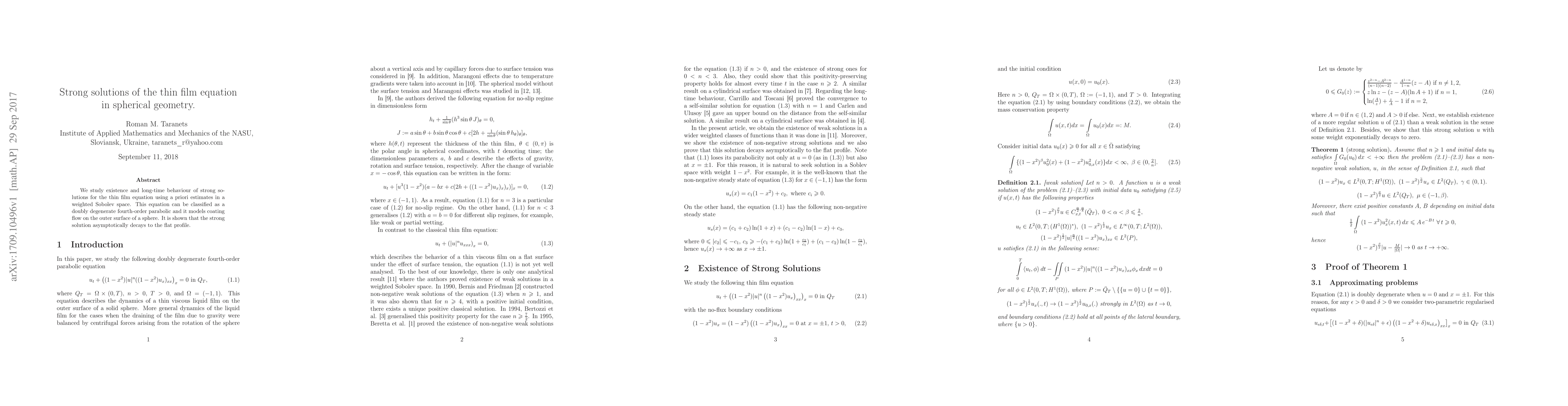 This paper investigates the existence and long-term behavior of strong solutions for the thin film equation in spherical geometry, demonstrating their asymptotic decay to a flat profile through a priori estimates in a weighted Sobolev space. The equation models coating flow on a sphere and is classified as a doubly degenerate fourth-order parabolic.