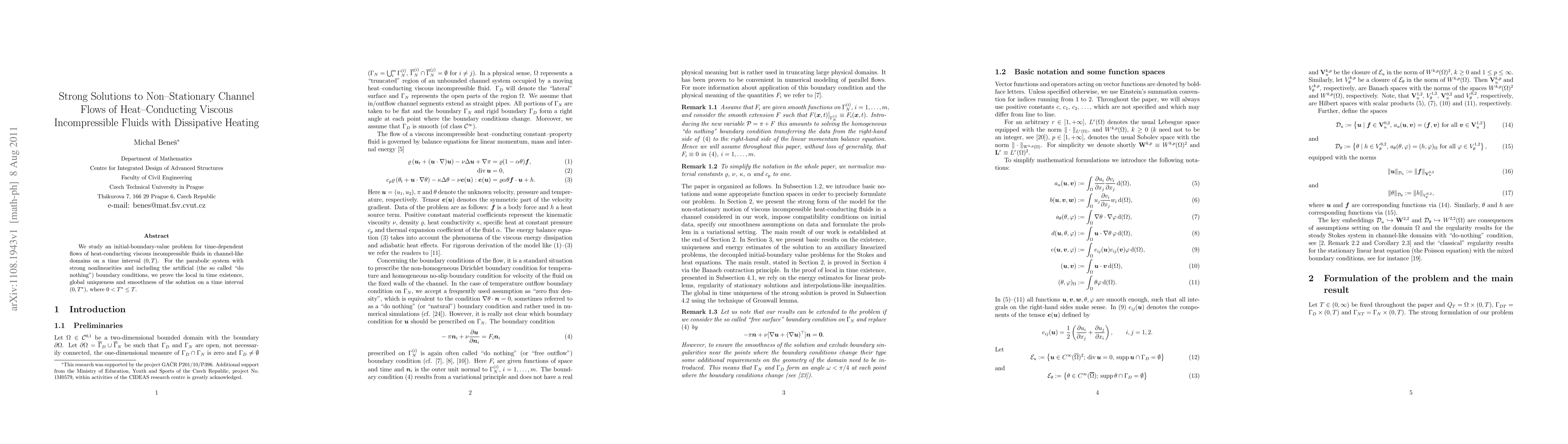 We study an initial-boundary-value problem for time-dependent flows of heat-conducting viscous incompressible fluids in channel-like domains on a time interval $(0,T)$. For the parabolic system with strong nonlinearities and including the artificial (the so called "do nothing") boundary conditions, we prove the local in time existence, global uniqueness and smoothness of the solution on a time interval $(0,T^*)$, where $0< T^* \leq T$.