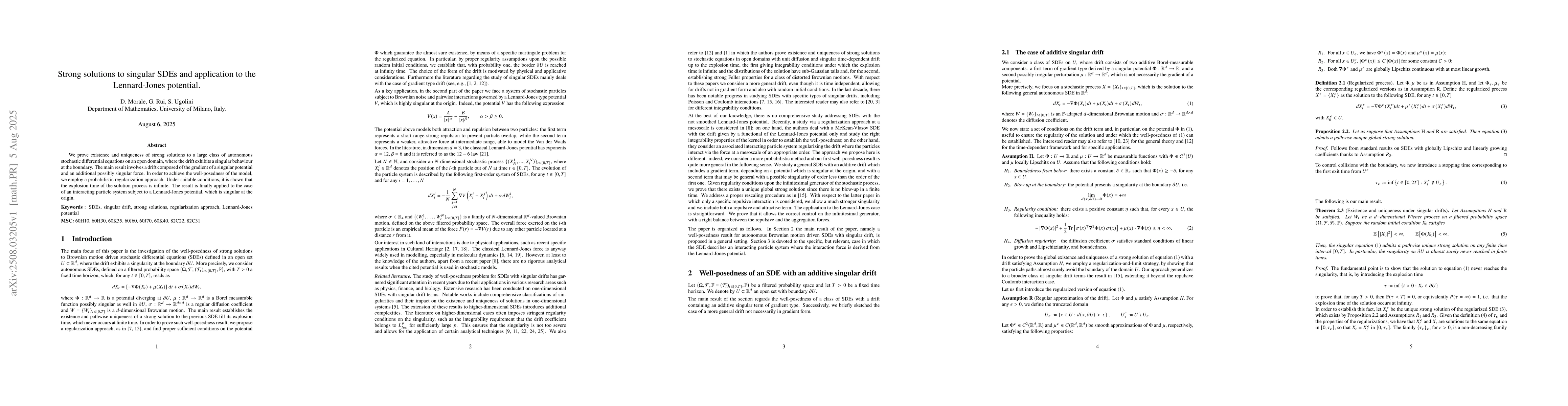 This research proves the existence and uniqueness of strong solutions for singular stochastic differential equations (SDEs) with a drift that behaves singularly at the boundary. Using a probabilistic regularization method, it shows that the solution process never explodes under certain conditions. The findings are applied to a particle system under a Lennard-Jones potential, which is singular at the origin.