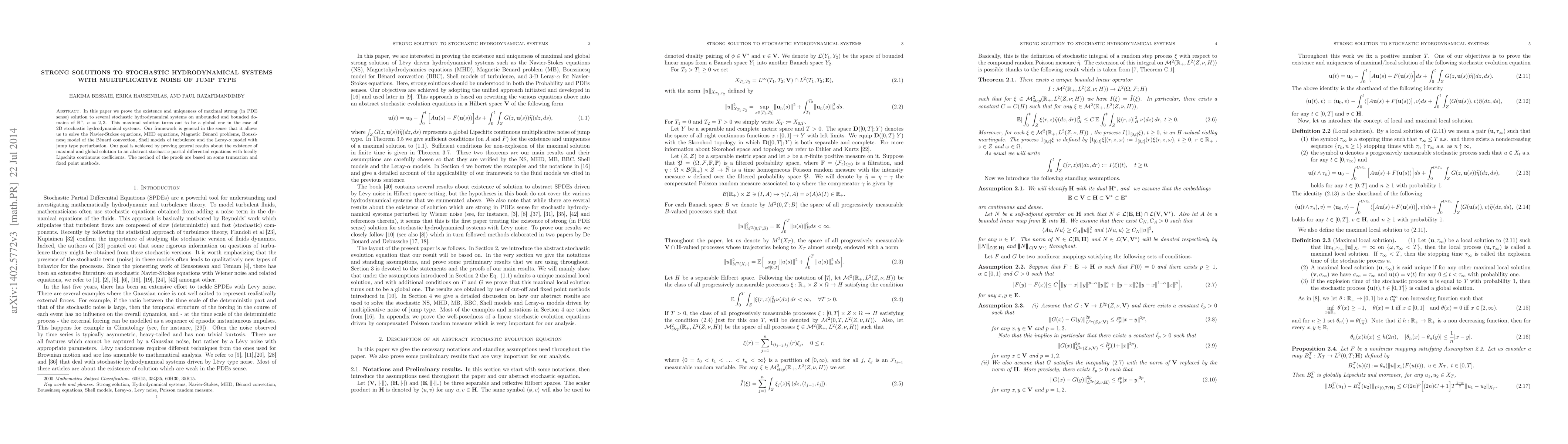 In this paper we prove the existence and uniqueness of maximal strong (in PDE sense) solution to several stochastic hydrodynamical systems on unbounded and bounded domains of $\mathbb{R}^n$, $n=2,3$. This maximal solution turns out to be a global one in the case of 2D stochastic hydrodynamical systems. Our framework is general in the sense that it allows us to solve the Navier-Stokes equations, MHD equations, Magnetic B\'enard problems, Boussinesq model of the B\'enard convection, Shell models of turbulence and the Leray-$\alpha$ model with jump type perturbation. Our goal is achieved by proving general results about the existence of maximal and global solution to an abstract stochastic partial differential equations with locally Lipschitz continuous coefficients. The method of the proofs are based on some truncation and fixed point methods.