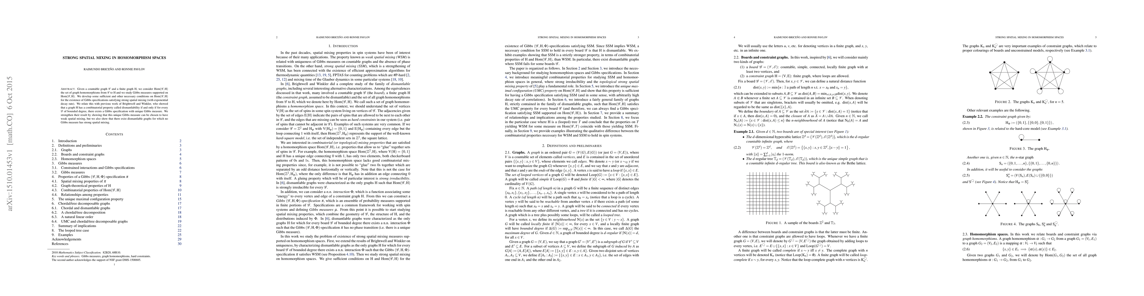 This paper investigates the existence of Gibbs measures on the set of graph homomorphisms from $\mathcal{G}$ to $\mathrm{H}$ that exhibit strong spatial mixing. It strengthens previous results by showing that while dismantlable graphs can have unique Gibbs measures with weak spatial mixing, not all dismantlable graphs support Gibbs measures with strong spatial mixing.