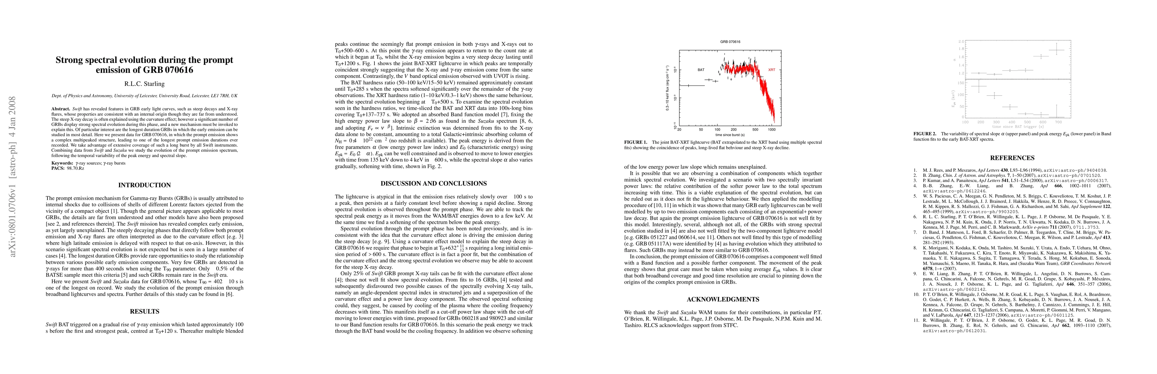 Swift has revealed features in GRB early light curves, such as steep decays and X-ray flares, whose properties are consistent with an internal origin though they are far from understood. The steep X-ray decay is often explained using the curvature effect; however a significant number of GRBs display strong spectral evolution during this phase, and a new mechanism must be invoked to explain this. Of particular interest are the longest duration GRBs in which the early emission can be studied in most detail. Here we present data for GRB 070616, in which the prompt emission shows a complex multipeaked structure, leading to one of the longest prompt emission durations ever recorded. We take advantage of extensive coverage of such a long burst by all Swift instruments. Combining data from Swift and Suzaku we study the evolution of the prompt emission spectrum, following the temporal variability of the peak energy and spectral slope.