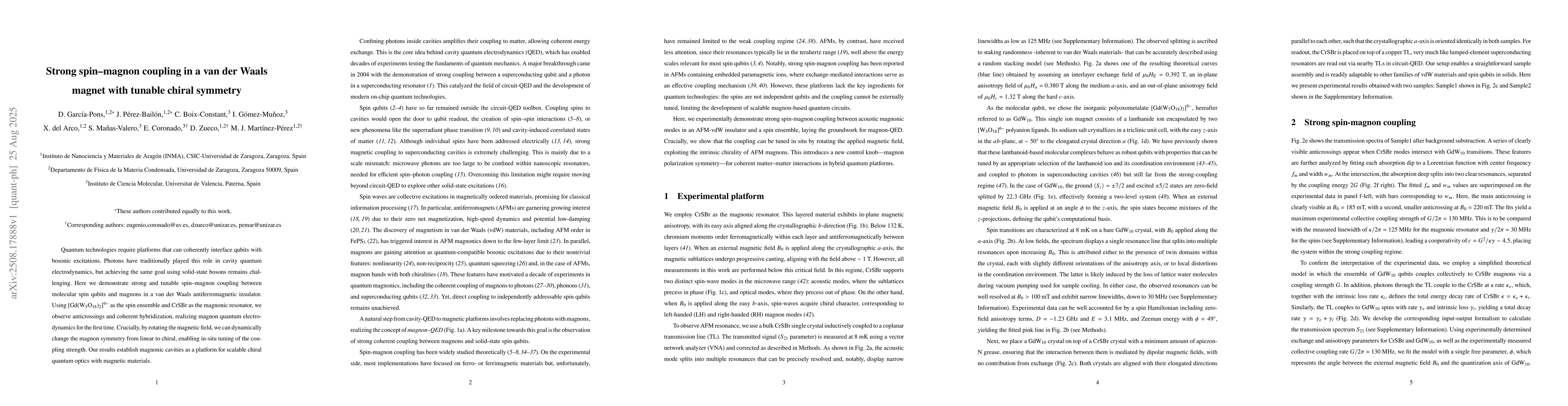 Quantum technologies require platforms that can coherently interface qubits with bosonic excitations. Photons have traditionally played this role in cavity quantum electrodynamics, but achieving the same goal using solid-state bosons remains challenging. Here we demonstrate strong and tunable spin-magnon coupling between molecular spin qubits and magnons in a van der Waals antiferromagnetic insulator. Using [Gd(W$_5$O$_{18}$)$_{2}$]$^{9-}$ as the spin ensemble and CrSBr as the magnonic resonator, we observe anticrossings and coherent hybridization, realizing magnon quantum electrodynamics for the first time. Crucially, by rotating the magnetic field, we can dynamically change the magnon symmetry from linear to chiral, enabling in-situ tuning of the coupling strength. Our results establish magnonic cavities as a platform for scalable chiral quantum optics with magnetic materials.