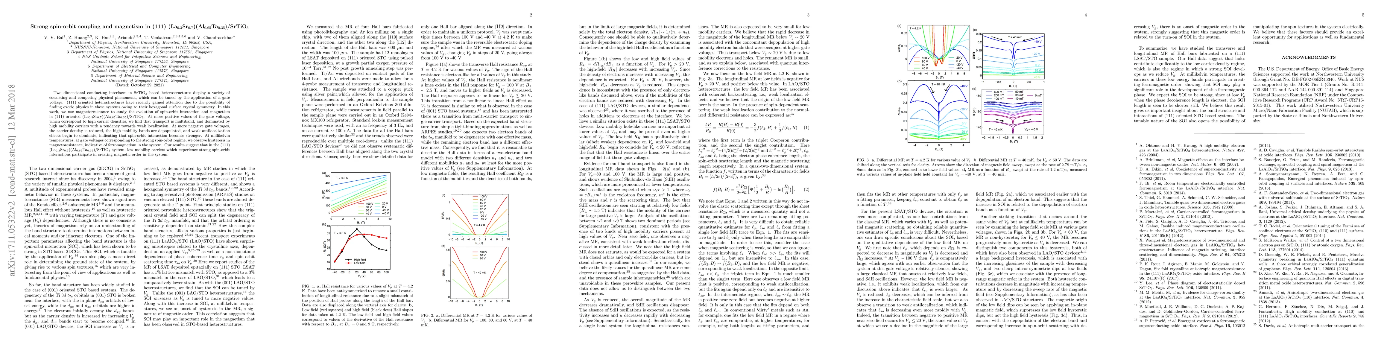 Strong correlations, multiple lattice degrees of freedom, and the ease of doping make complex oxides a source of great research interest. Complex oxide heterointerfaces break inversion symmetry and can host a two dimensional carrier gas, which can display a variety of coexisting and competing phenomena. In the case of heterointerfaces based on SrTiO$_3$, many of these phenomena can be effectively tuned by using an electric gate, due to the large dielectric constant of SrTiO$_3$. Most studies so far have focused on (001) oriented heterostructures; however, (111) oriented heterostructures have recently gained attention due to the possibility of finding exotic physics in these systems due their hexagonal surface crystal symmetry. In this work, we use magnetoresistance to study the evolution of spin-orbit interaction and magnetism in a new system, (111) oriented (La$_{0.3}$Sr$_{0.7}$)(Al$_{0.65}$Ta$_{0.35}$)/SrTiO$_3$. At more positive values of the gate voltage, which correspond to high carrier densities, we find that transport is multiband, and dominated by high mobility carriers with a tendency towards weak localization. At more negative gate voltages, the carrier density is reduced, the high mobility bands are depopulated, and weak antilocalization effects begin to dominate, indicating that spin-orbit interaction becomes stronger. At millikelvin temperatures, and gate voltages corresponding to the strong spin-orbit regime, we observe hysteresis in magnetoresistance, indicative of ferromagnetism in the system. Our results suggest that in the (111) (La$_{0.3}$Sr$_{0.7}$)(Al$_{0.65}$Ta$_{0.35}$)/SrTiO$_3$ system, low mobility carriers which experience strong spin-orbit interactions participate in creating magnetic order in the system.