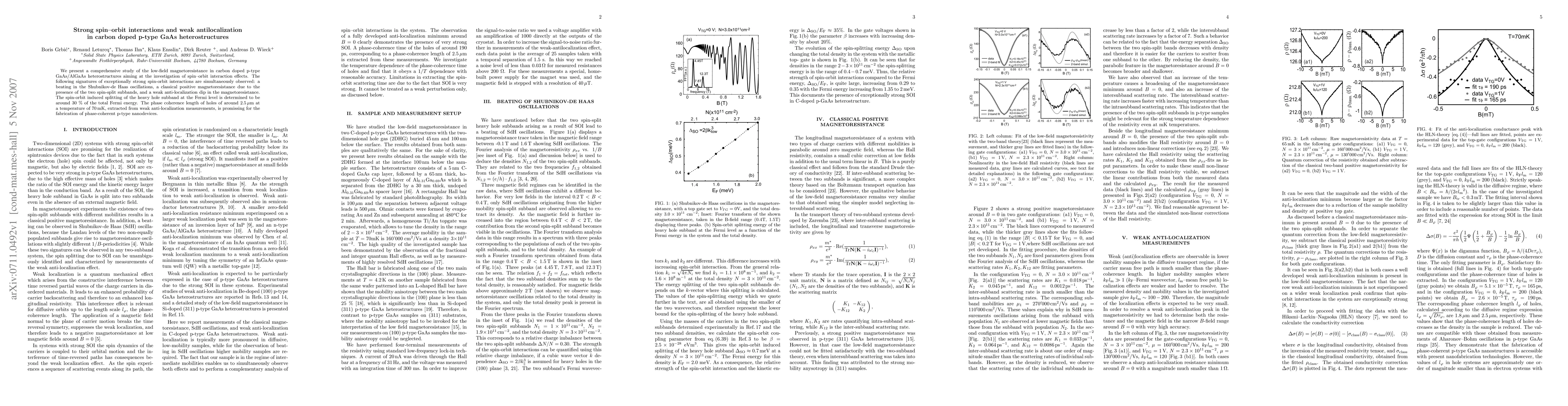 This research investigates strong spin-orbit interactions in carbon-doped p-type GaAs/AlGaAs heterostructures, observing beating in Shubnikov-de Haas oscillations and weak antilocalization. The study determines a spin-orbit induced splitting of approximately 30% of the Fermi energy and finds a phase coherence length of around 2.5 µm at 70 mK, indicating potential for p-type nanodevices.