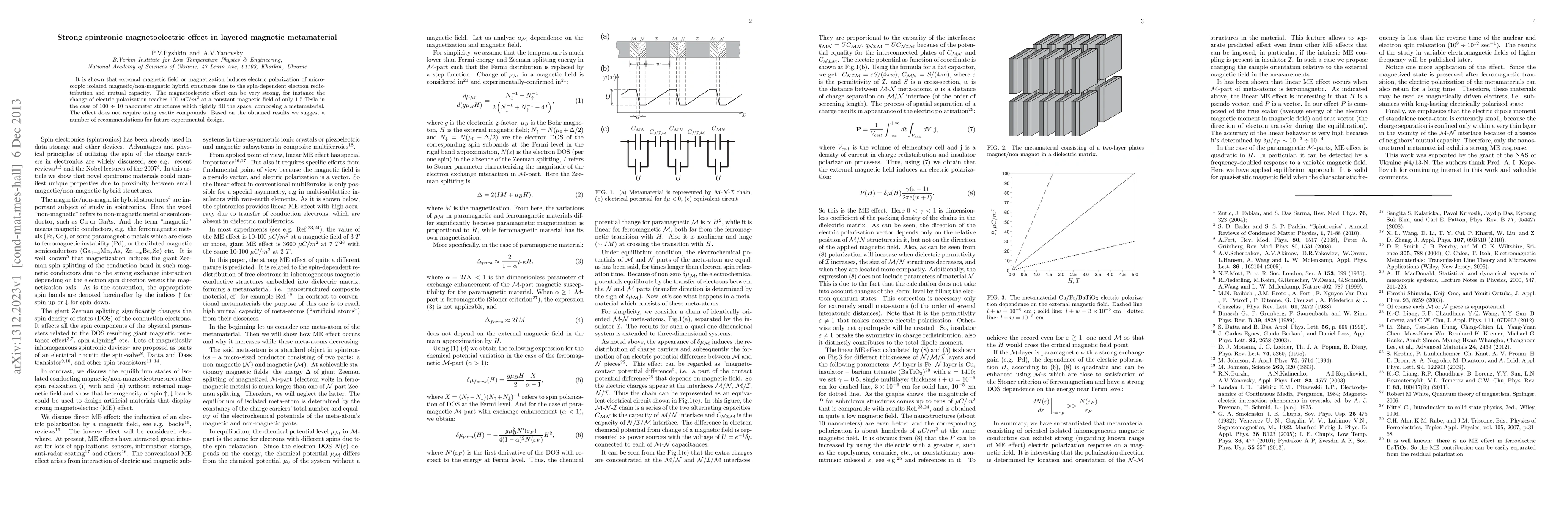 It is shown that external magnetic field or magnetization induces electric polarization of microscopic isolated magnetic/non-magnetic hybrid structures due to the spin-dependent electron redistribution and mutual capacity. The magnetoelectric effect can be very strong, for instance the change of electric polarization reaches $100$ $\mu C/m^{2}$ at a constant magnetic field of only $1.5$ Tesla in the case of $100$ $\div$ $10$ nanometer structures which tightly fill the space, composing a metamaterial. The effect does not require using exotic compounds. Based on the obtained results we suggest a number of recommendations for future experimental design.