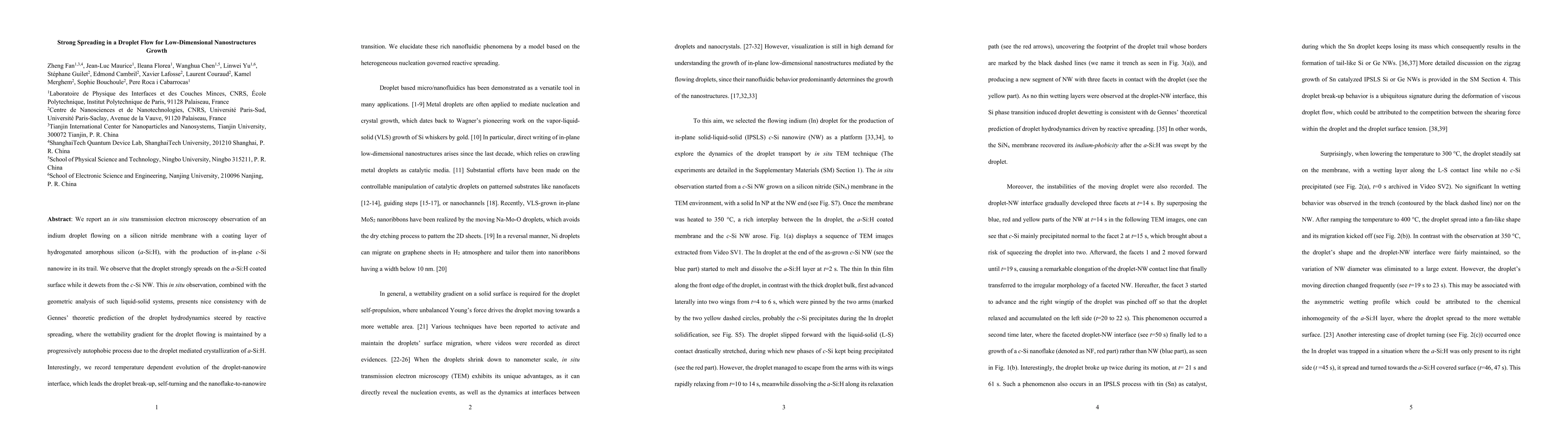 We report an in situ transmission electron microscopy observation of an indium droplet flowing on a silicon nitride membrane with a coating layer of hydrogenated amorphous silicon (a-Si:H), with the production of in-plane c-Si nanowire in its trail. We observe that the droplet strongly spreads on the a-Si:H coated surface while it dewets from the c-Si NW. This in situ observation, combined with the geometric analysis of such liquid-solid systems, presents nice consistency with de Gennes theoretic prediction of the droplet hydrodynamics steered by reactive spreading, where the wettability gradient for the droplet flowing is maintained by a progressively autophobic process due to the droplet mediated crystallization of a-Si:H. Interestingly, we record temperature dependent evolution of the droplet-nanowire interface, which leads the droplet break-up, self-turning and the nanoflake-to-nanowire transition. We elucidate these rich nanofluidic phenomena by a model based on the heterogeneous nucleation governed reactive spreading.