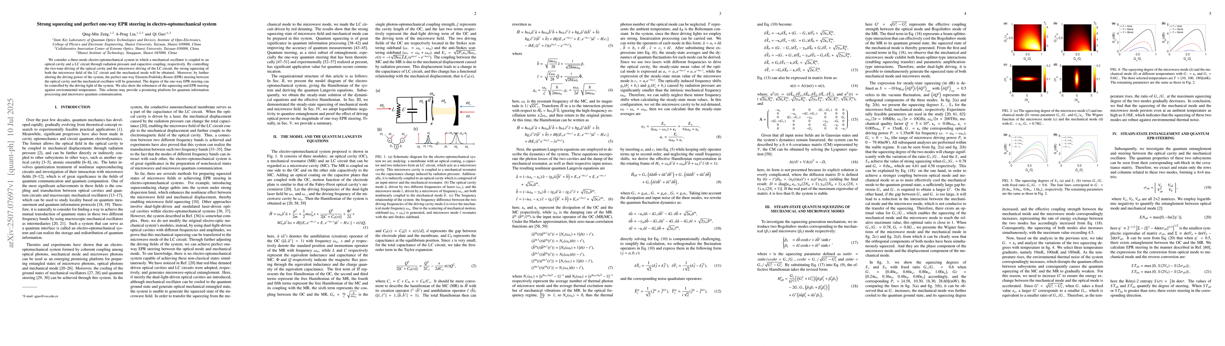 We consider a three-mode electro-optomechanical system in which a mechanical oscillator is coupled to an optical cavity and a LC circuit through radiation pressure and capacitive coupling, respectively. By controlling the two-tone driving of the optical cavity and the microwave driving of the LC circuit, the strong squeezing of both the microwave field of the LC circuit and the mechanical mode will be obtained. Moreover, by further altering the driving power of the system, the perfect one-way Einstein-Podolsky-Rosen (EPR) steering between the optical cavity and the mechanical oscillator will be generated. The degree of the one-way EPR steering can be controlled by the driving light of the system. We also show the robustness of the squeezing and EPR steering against environmental temperature. This scheme may provide a promising platform for quantum information processing and microwave quantum communication.