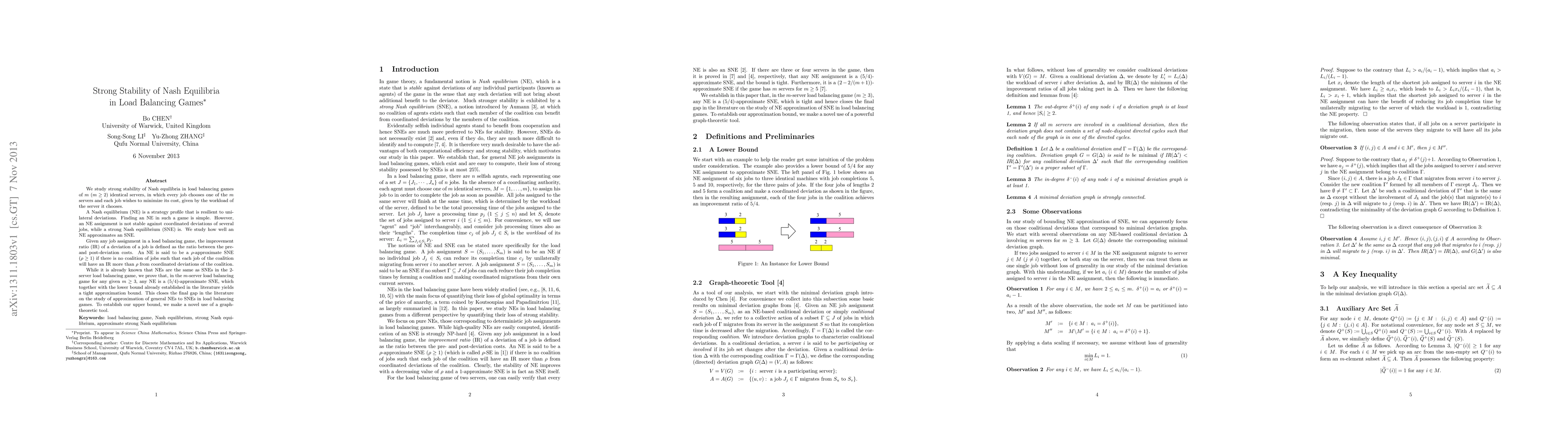 The paper presents a novel approach using graph theory to prove that any Nash equilibrium in m-server load balancing games (m ≥ 3) is a (5/4)-approximate strong Nash equilibrium, closing a long-standing gap in the literature.