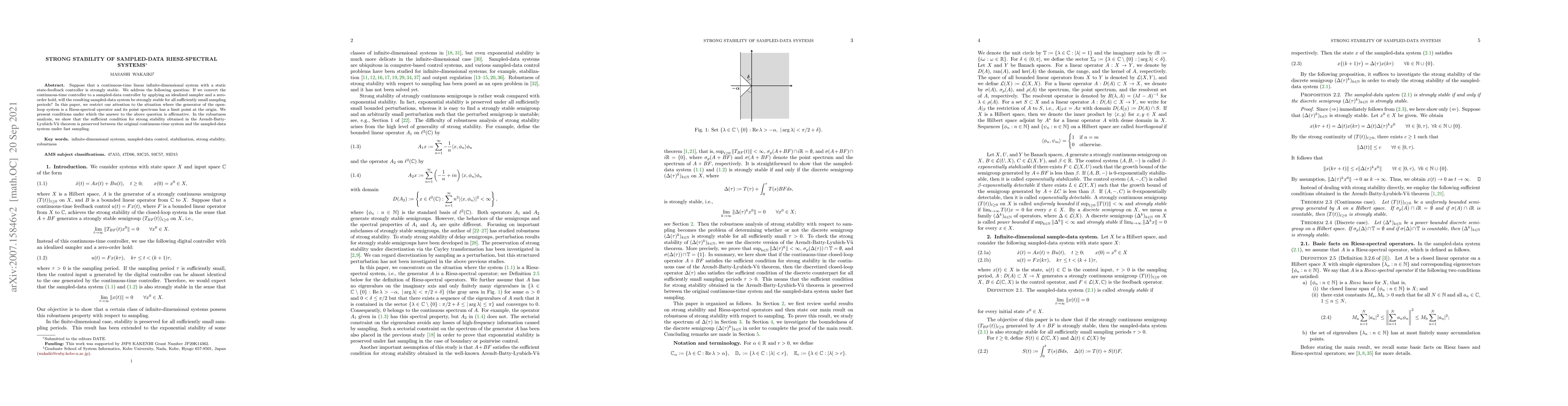 This paper investigates the strong stability of sampled-data systems derived from continuous-time linear infinite-dimensional systems with a static state-feedback controller. It establishes conditions under which the sampled-data system remains strongly stable for sufficiently small sampling periods, particularly when the system's generator is a Riesz-spectral operator with a limit point at the origin.