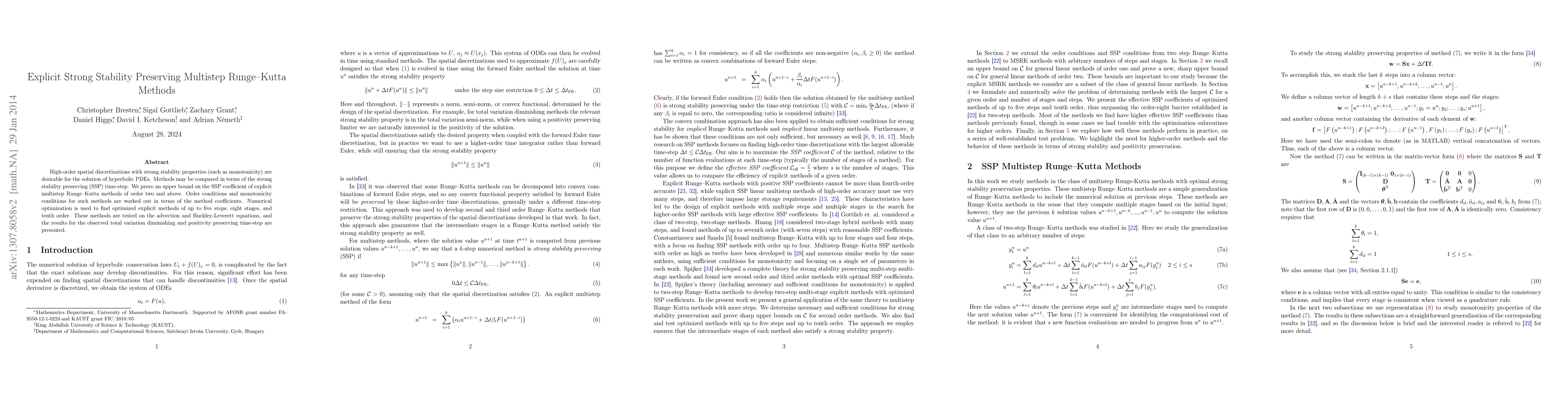 High-order spatial discretizations with strong stability properties (such as monotonicity) are desirable for the solution of hyperbolic PDEs. Methods may be compared in terms of the strong stability preserving (SSP) time-step. We prove an upper bound on the SSP coefficient of explicit multistep Runge--Kutta methods of order two and above. Order conditions and monotonicity conditions for such methods are worked out in terms of the method coefficients. Numerical optimization is used to find optimized explicit methods of up to five steps, eight stages, and tenth order. These methods are tested on the advection and Buckley-Leverett equations, and the results for the observed total variation diminishing and positivity preserving time-step are presented.
