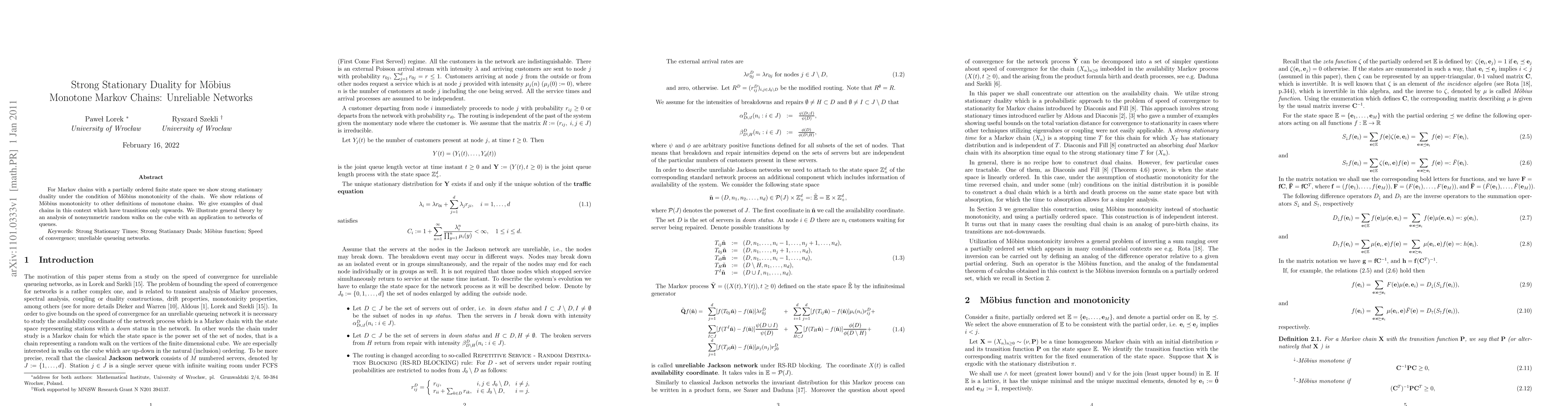 This paper establishes strong stationary duality for M\"obius monotone Markov chains under the condition of M\"obius monotonicity, relating it to other definitions of monotone chains. It provides examples of dual chains with upward transitions and applies the theory to nonsymmetric random walks on the cube, particularly in the context of unreliable networks.