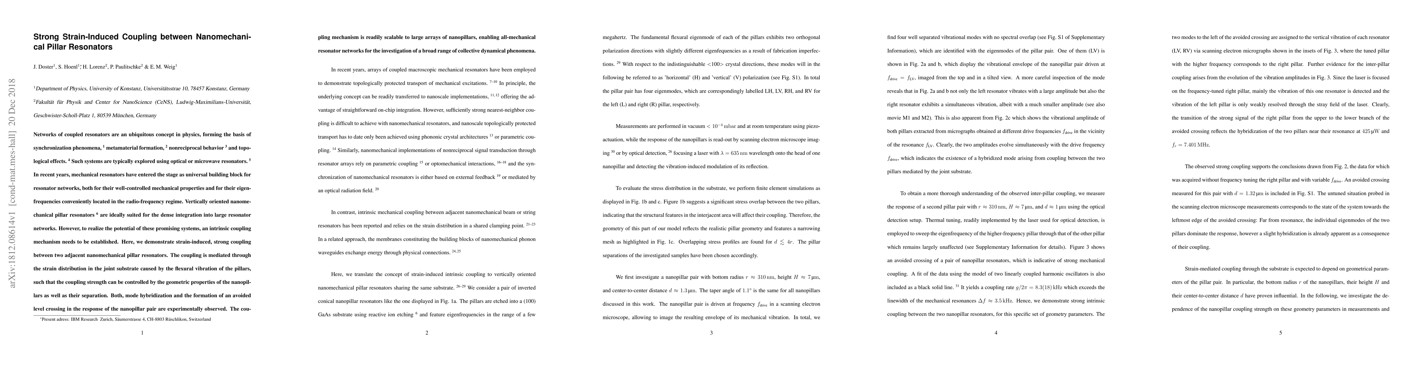 The research demonstrates strain-induced, strong coupling between two adjacent nanomechanical pillar resonators, mediated through strain distribution in the joint substrate caused by flexural vibration of the pillars. The coupling strength can be controlled by geometric properties of the nanopillars and their separation.
