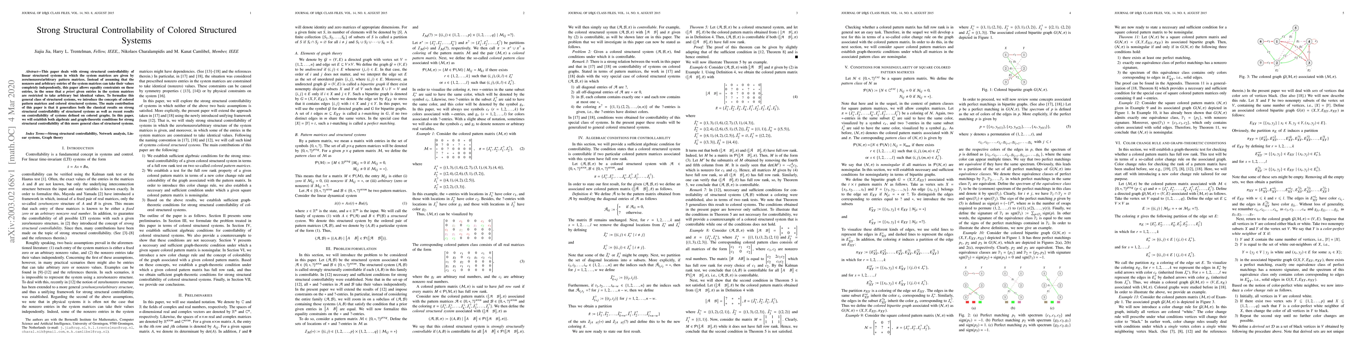 The paper introduces colored pattern matrices and colored structured systems, establishing algebraic conditions for strong structural controllability and graph-theoretic conditions for nonsingularity of colored pattern matrices.