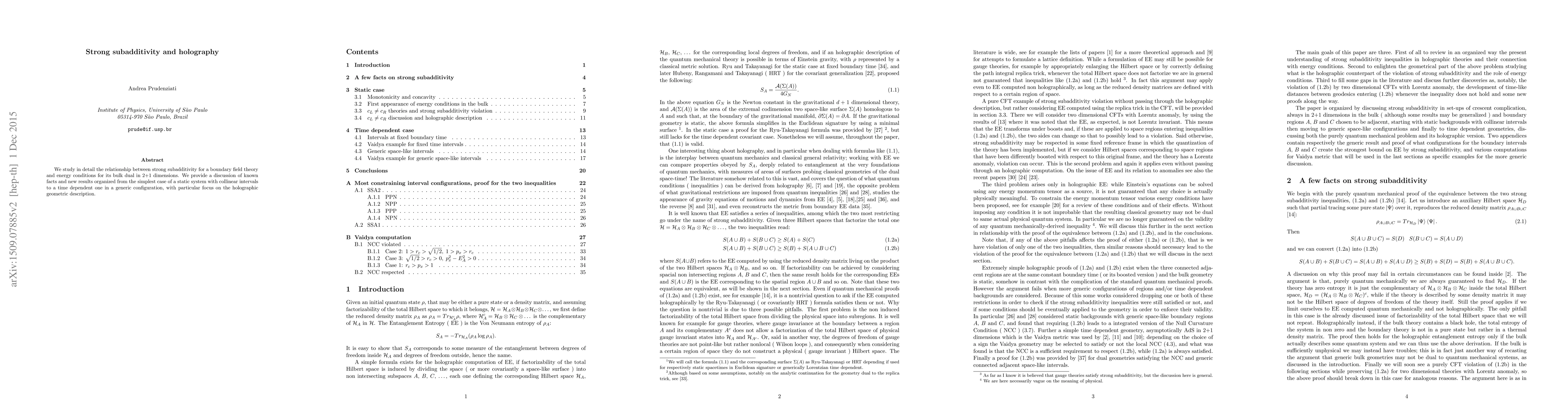 We study in detail the relationship between strong subadditivity for a boundary field theory and energy conditions for its bulk dual in 2+1 dimensions. We provide a discussion of known facts and new results organized from the simplest case of a static system with collinear intervals to a time dependent one in a generic configuration, with particular focus on the holographic geometric description.